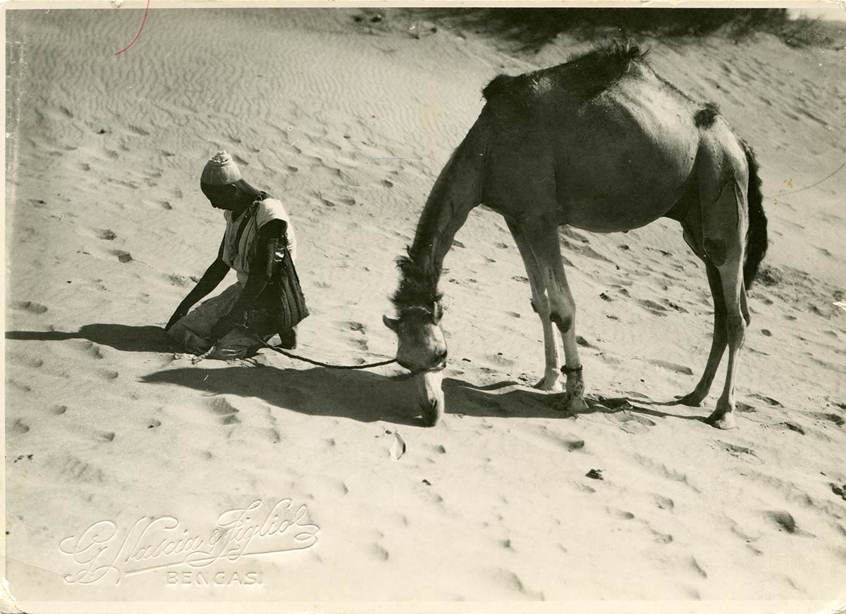 Aristotipo su carta di buona grammatura. Punzone dell'autore sul fronte: Gaetano Nascia & Figlio, Bengasi. Nella foto un nomade con dromedario. Composizione meravigliosa. Dimensioni:17 x 12 Cm