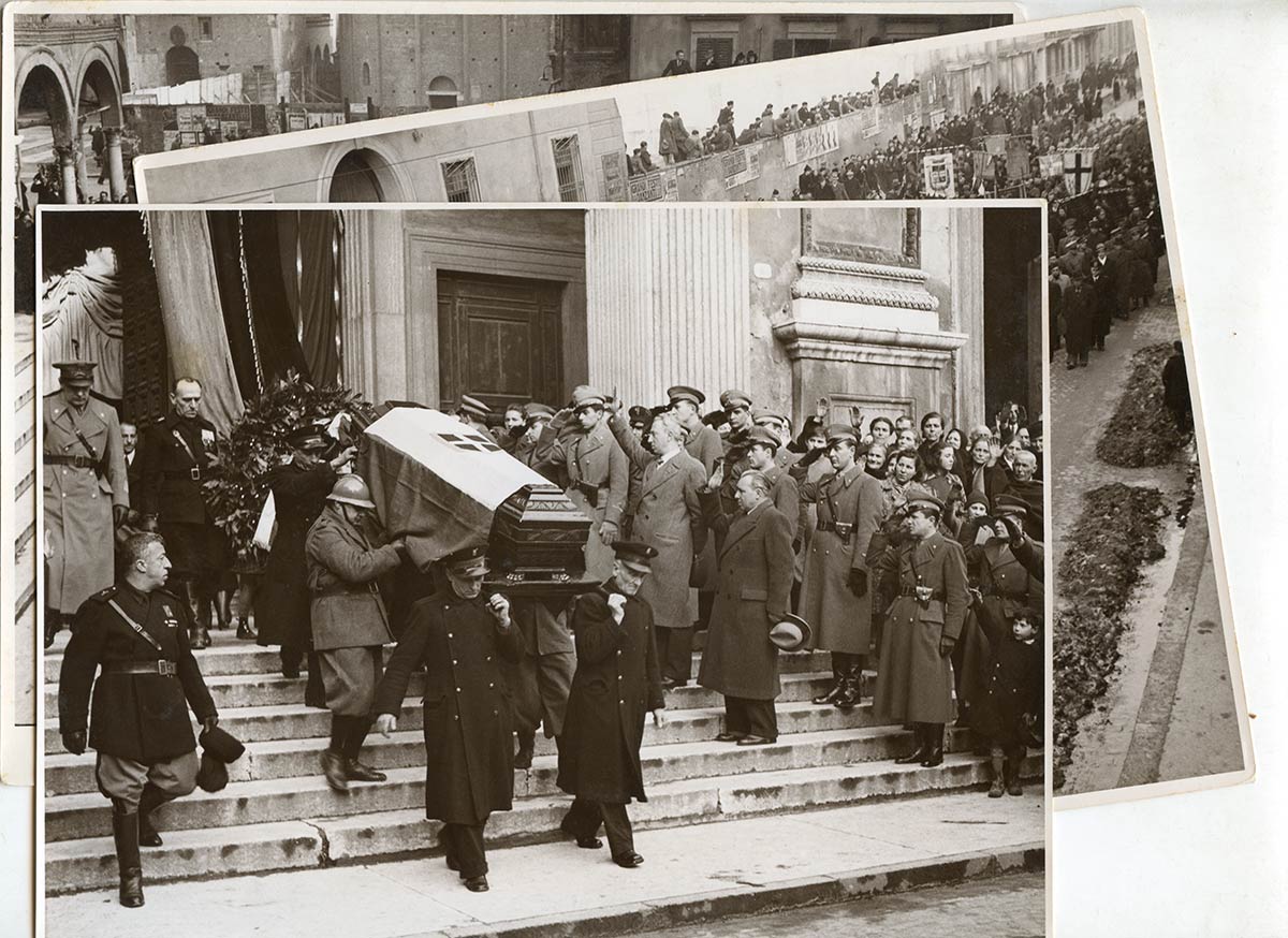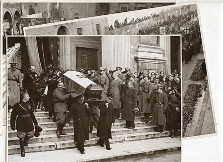 Lotto di tre fotografie. Stampe su carta smaltata (aristotipo). Timbro del fotografo Calzolari al retro. Nelle foto funerale e corteo funebre di personaggio non identificato. Presenti molte cariche civili e militari del ventennio. Dimensioni 23,5 x 18 Cm