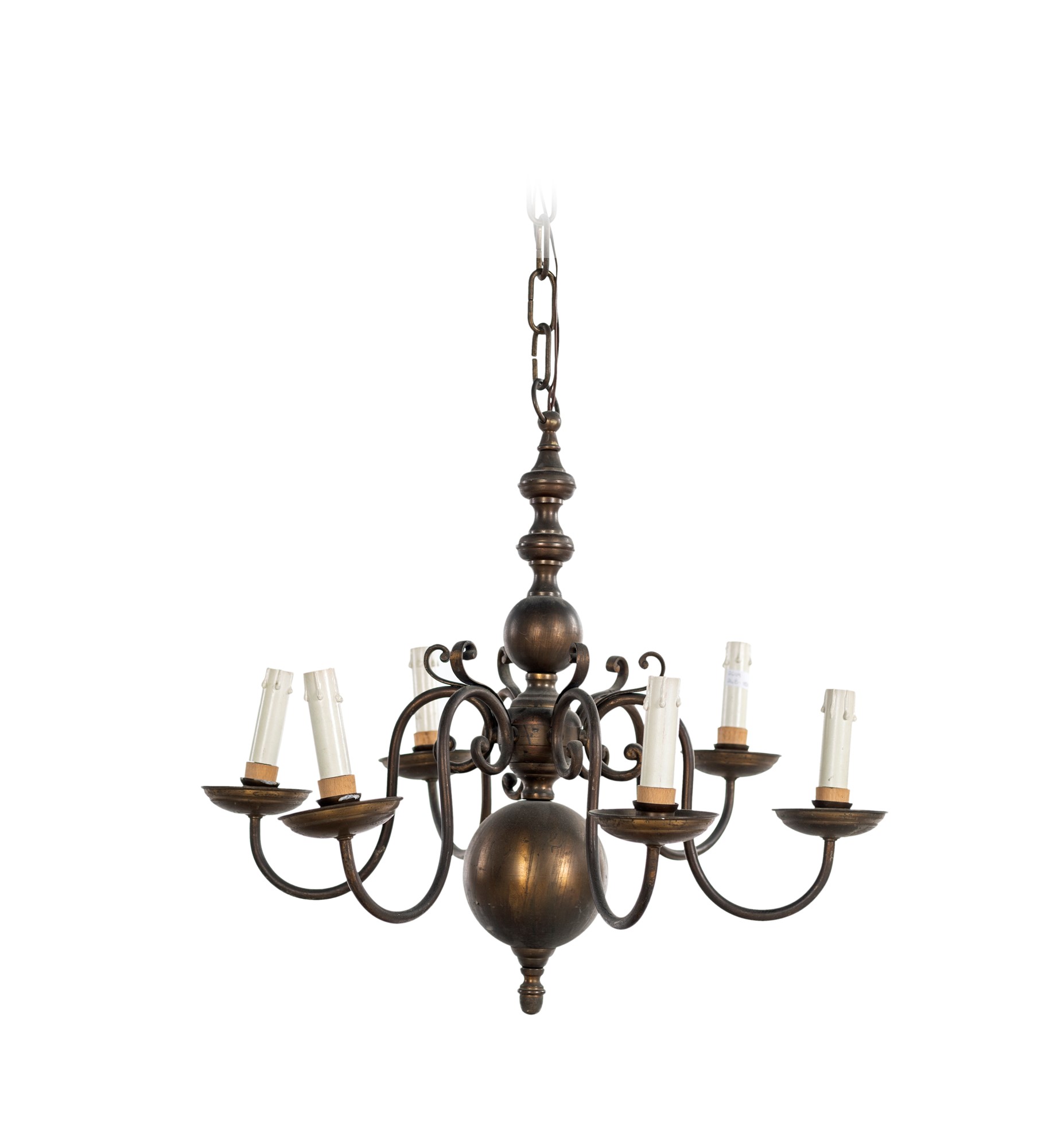 Lampadario in ottone stile olandese a sei luci con braccetti sagomati disposti intorno al balaustro centrale tornito altezza cm 50 esclusa la catena; diametro cm 62