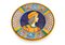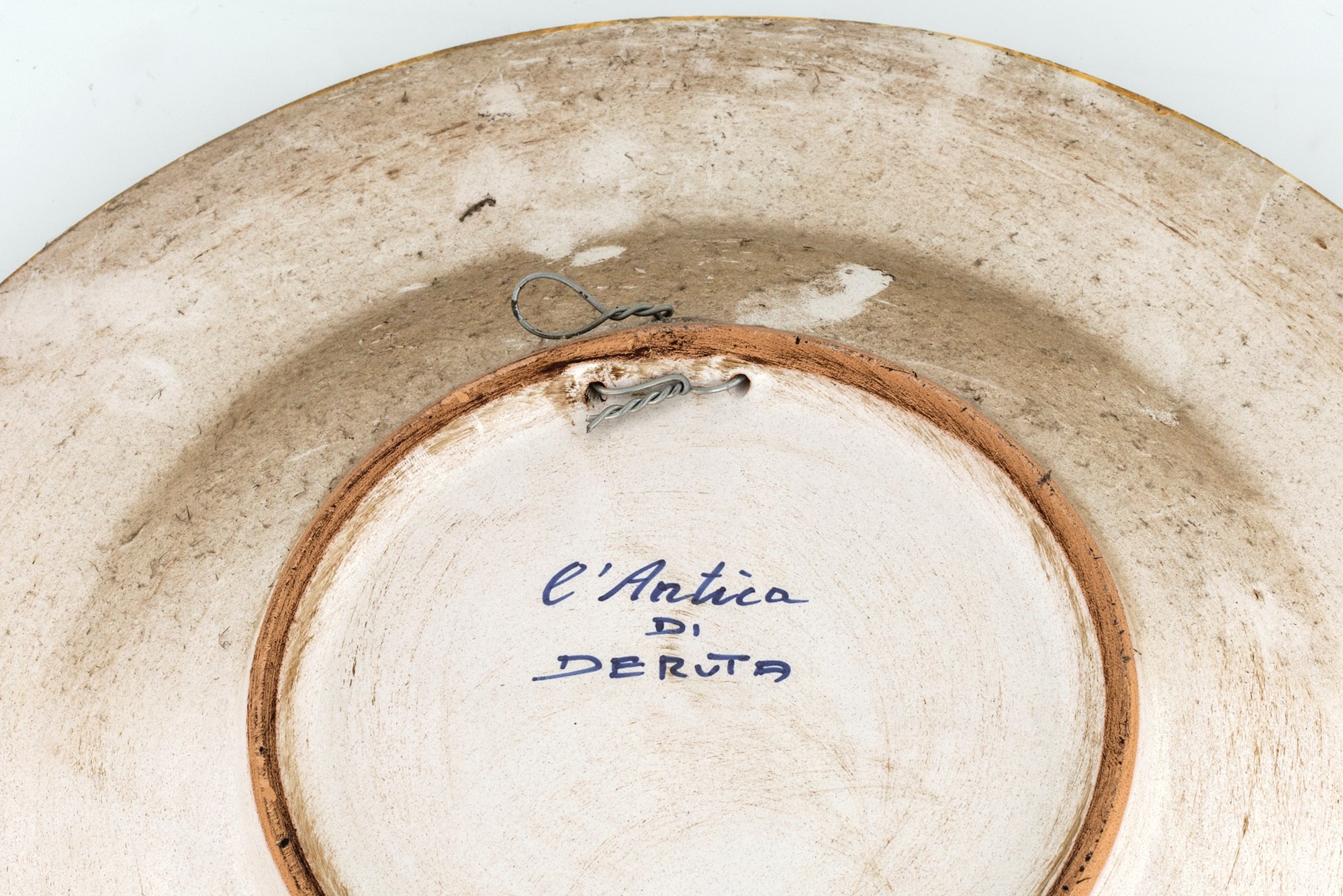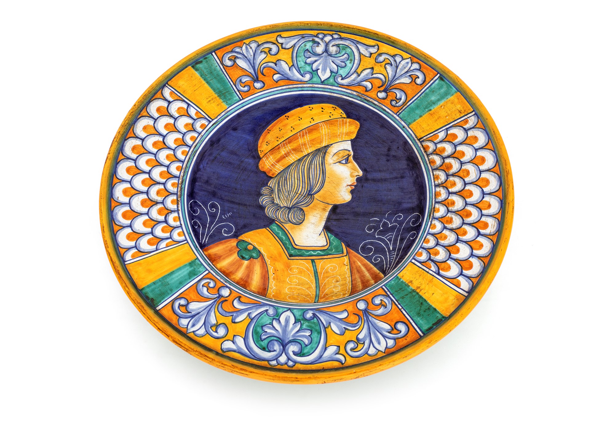 Piatto in maiolica, Deruta decorato con profilo di giovane nel cavetto e ampia tesa a motivi stilizzati nei toni caratteristici della manifattura. diametro cm 35,5