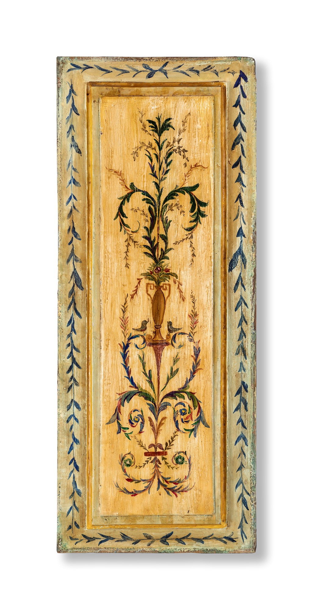 Pannello in legno dipinto decorato a raffaellesche su fondo crema cm 80x35 ca