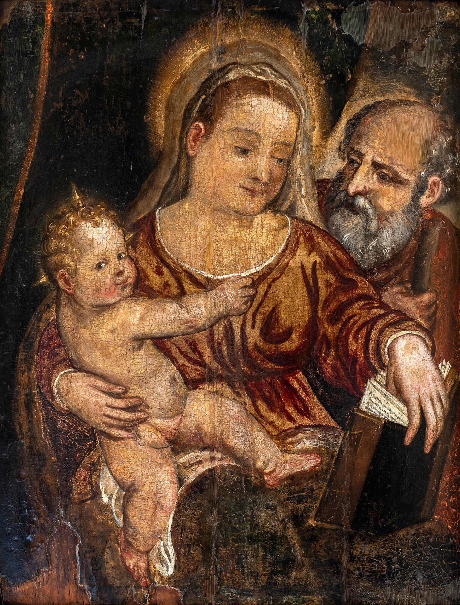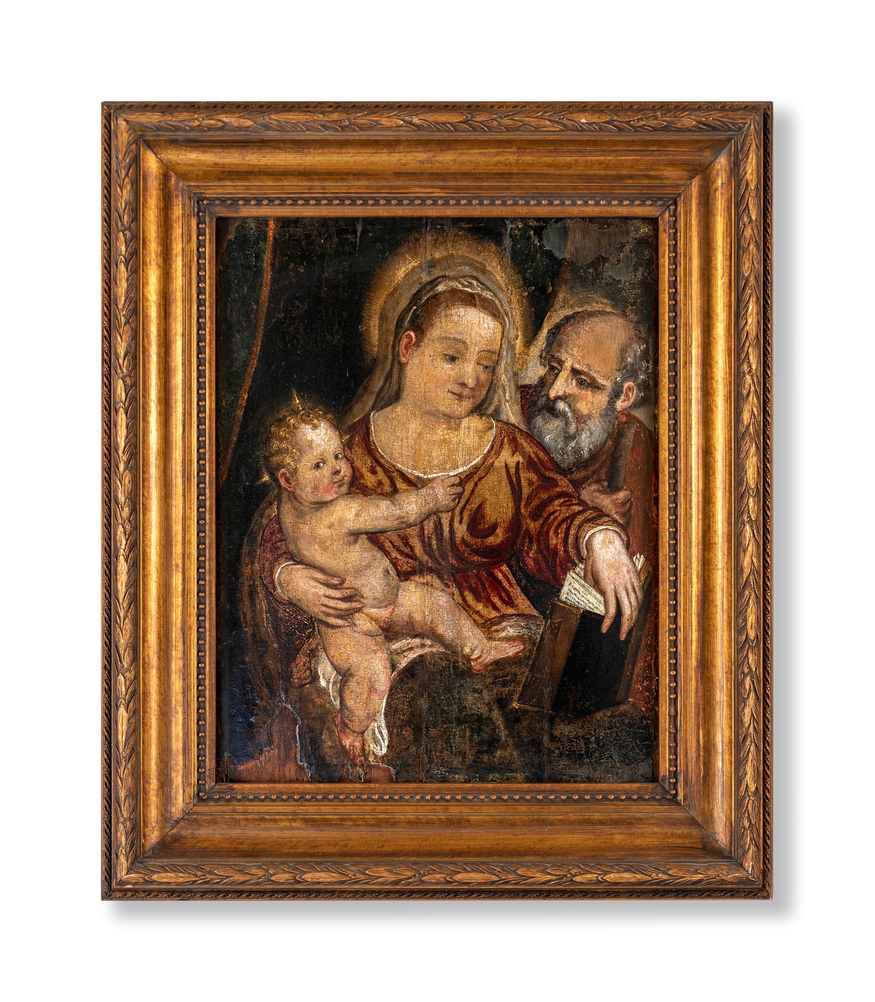 Pittore del XIX secolo 0-0 Sacra Famiglia Nel dipinto sono rappresentate due delle iconografie mariane più care alla cristianità: quelle della Sacra Famiglia che riunisce la Madonna col Bambino e San Giuseppe, e della Madonna col libro dove Maria appare assorta nella lettura dei testi sacri da sola, o come in questo caso, col Bambino in braccio. olio su tavola cm 50x40
