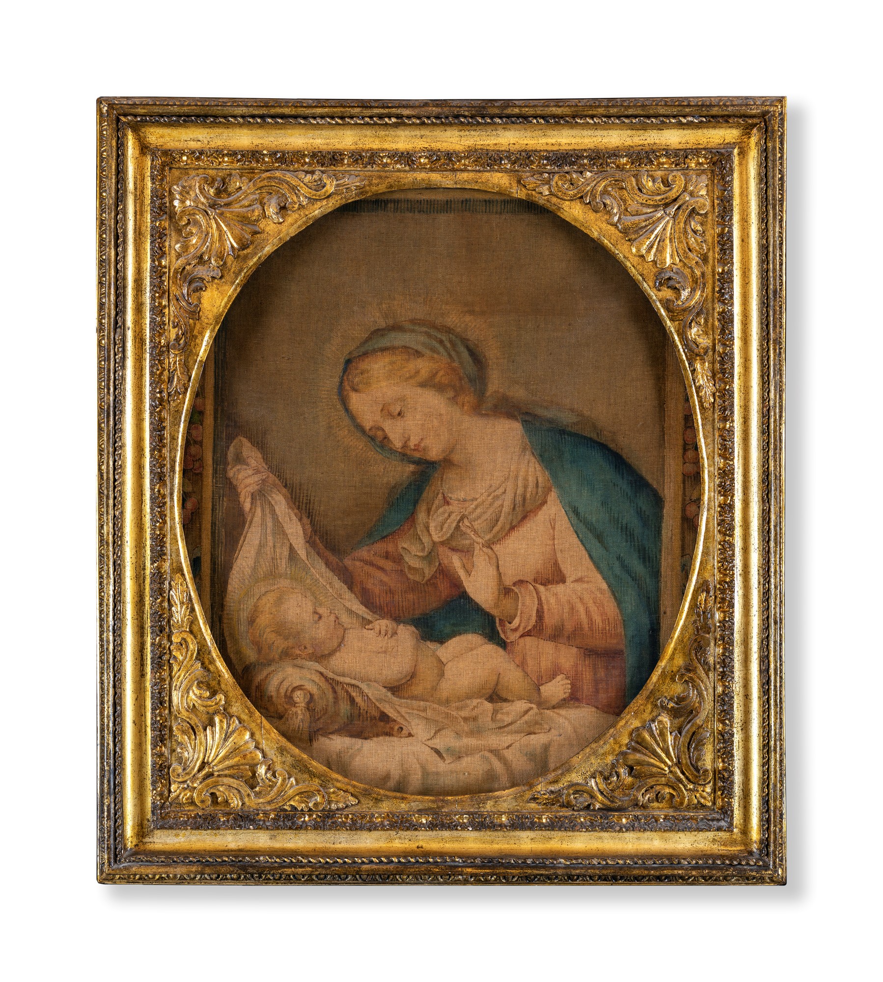 Cornice in legno dorato, XVIII secolo con luce ovale e rilievi angolari intagliati; all'interno succo d'erba raffigurante Madonna del velo ispirata ai prototipi di Carlo Dolci. cm 97x85