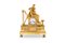 Orologio in bronzo dorato, XIX secolo caratterizzata da un'arpa che affianca la cassa di forma squadrata su cui siede una figura femminile con bimbo; quadrante in smalto bianco a due fori di carica e indicazione oraria a numeri romani, base rettangolare su piedi a rocchetto. cm 50x39x13