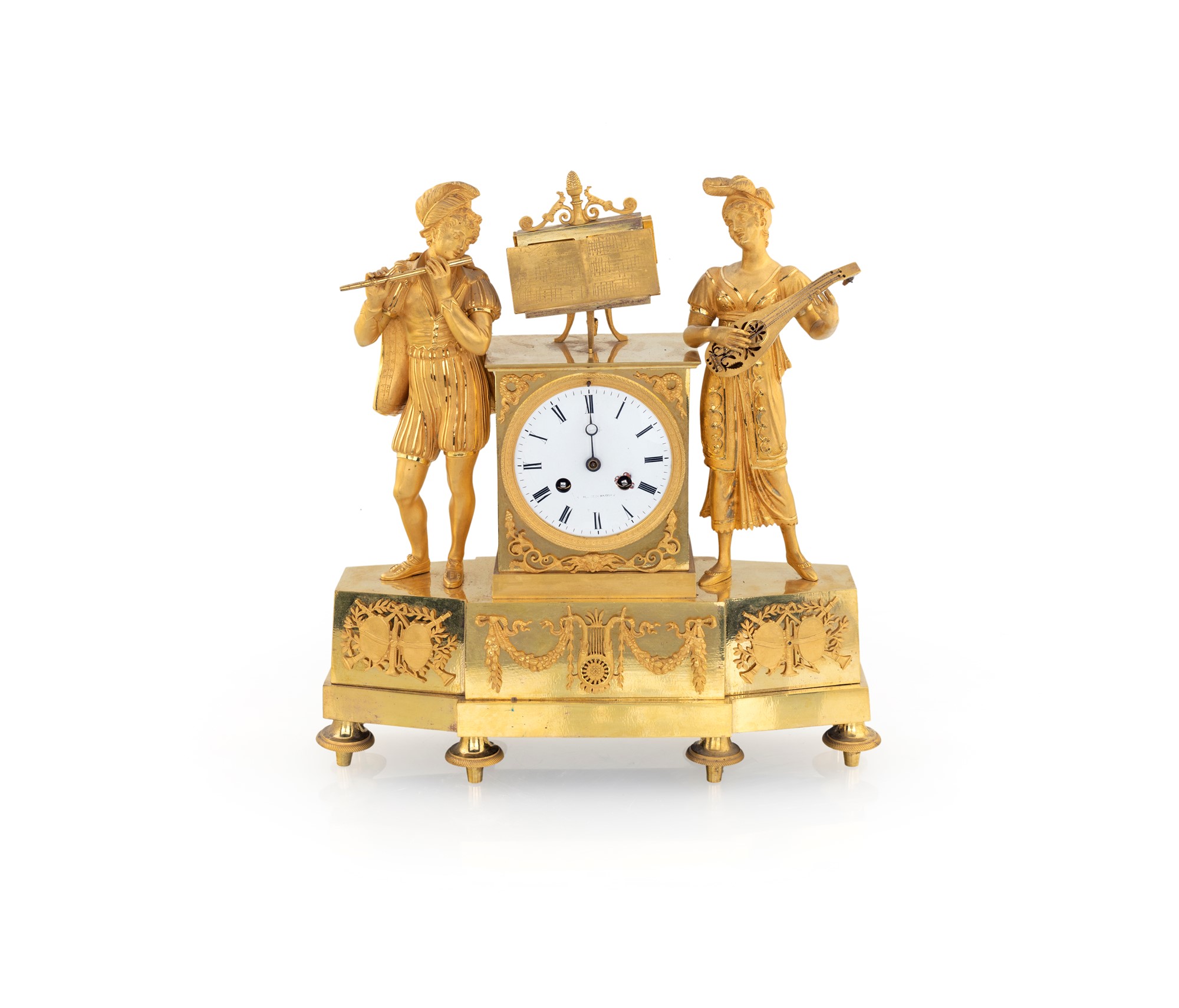Orologio in bronzo dorato, XIX secolo con due figure di musici poste ai lati della cassa sormontata da un leggio con spartito; base mistilinea impreziosita da rilievi cesellati, piedi a trottola. 38x36x9