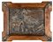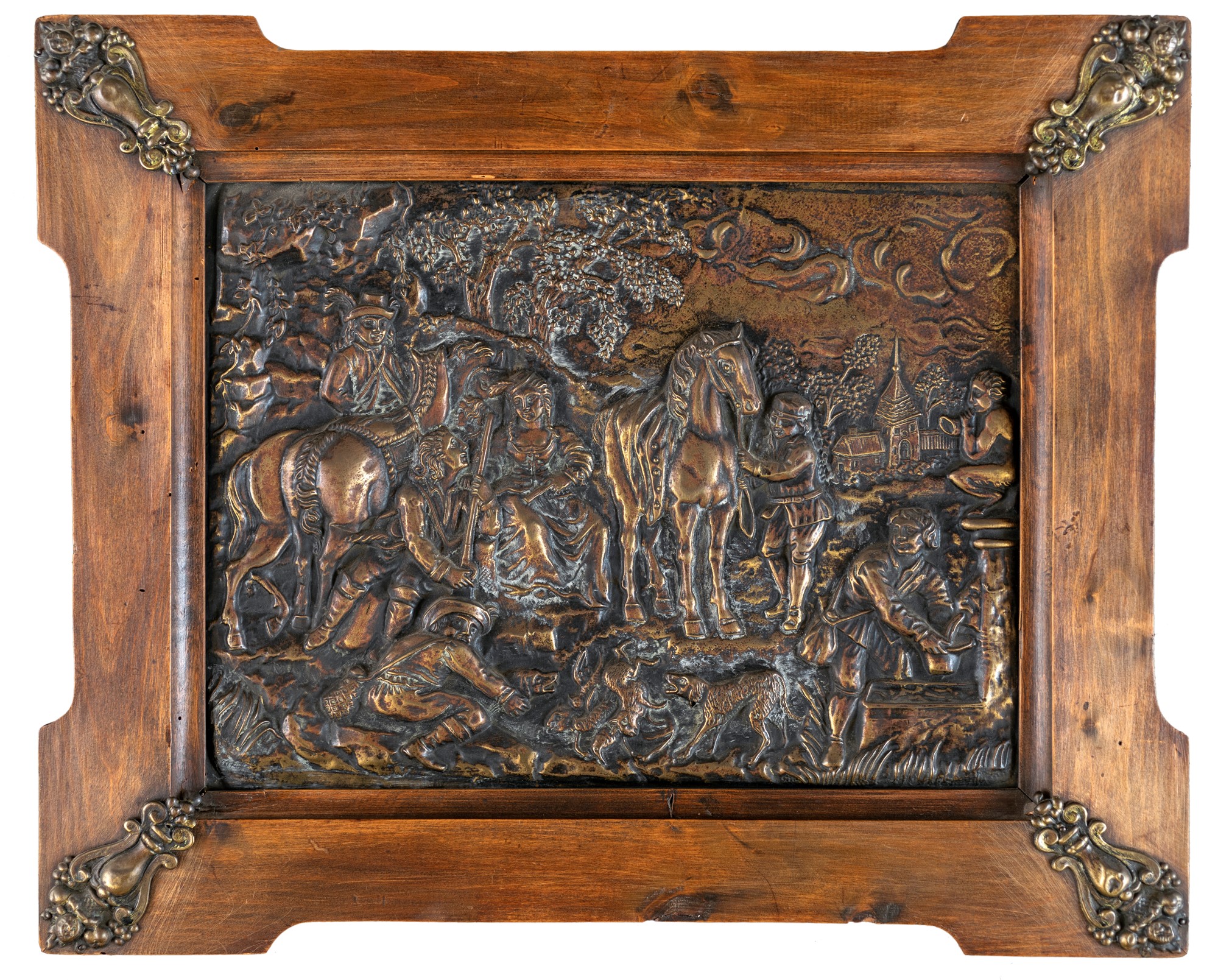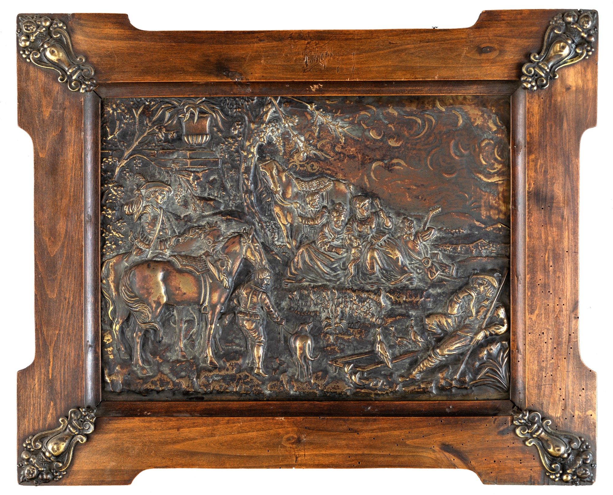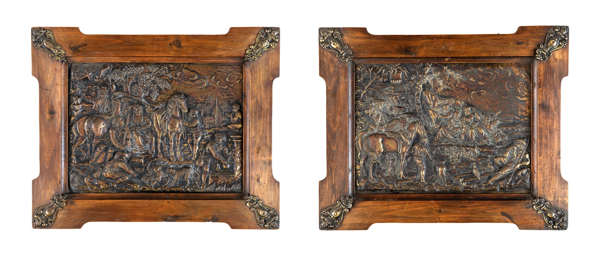 Coppia di bassorilievi in rame sbalzato raffiguranti paesaggi con cacciatori e dame, entro cornici in noce con angoli cuspidati abbelliti da rilievi in tolla. Inizio del XX secolo.  cm 31x42 - l'insieme: cm 48x59