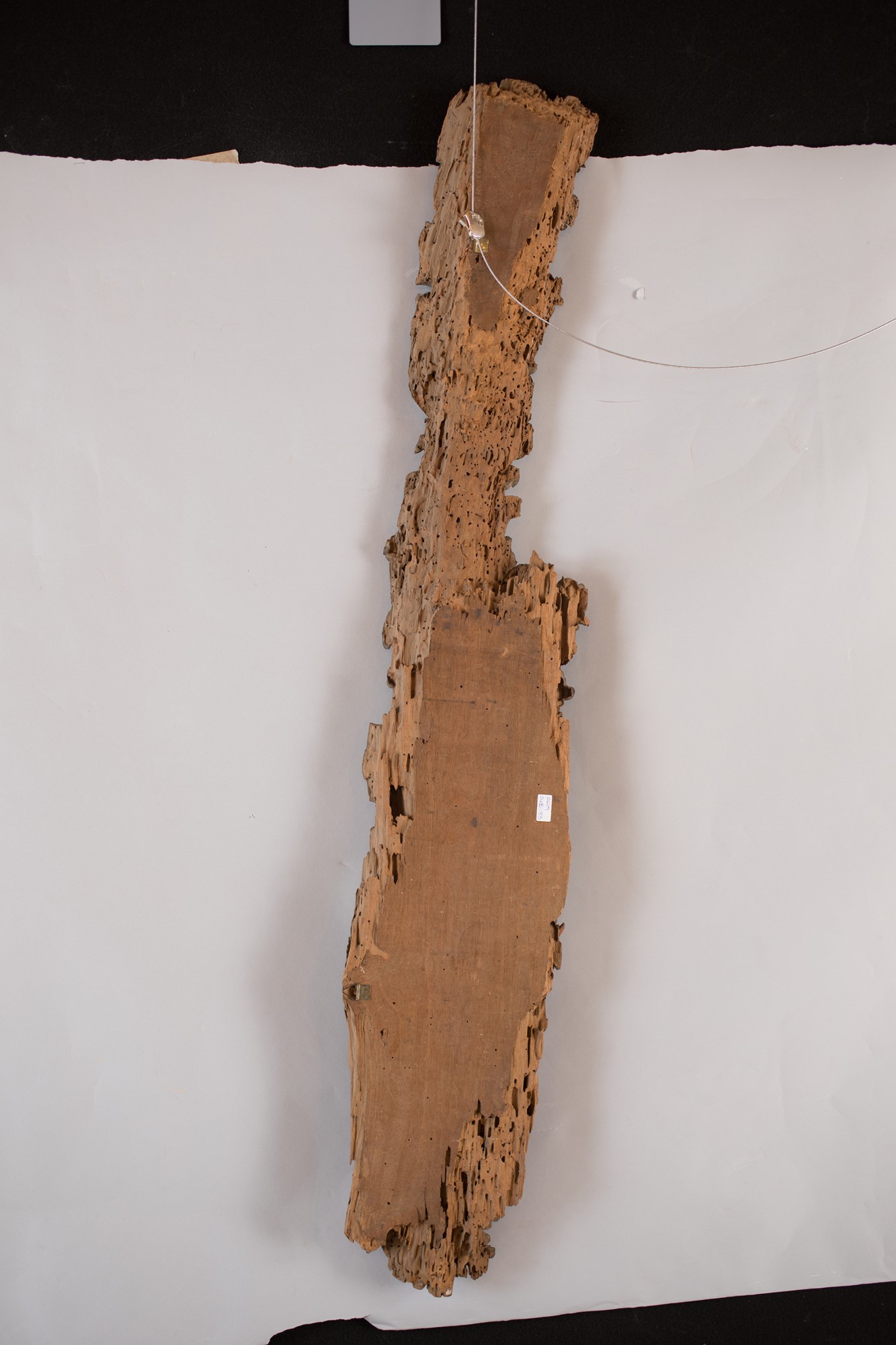 Antico fregio in noce intagliato costituito da volute e girali in sequenza, centrato da uno stemma con tre gigli ed un cane. Difetti. cm 23x133