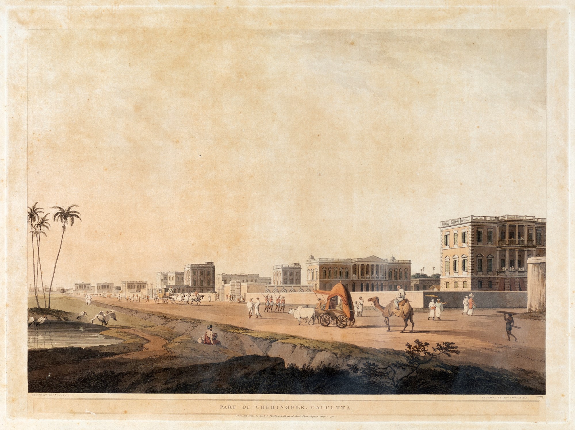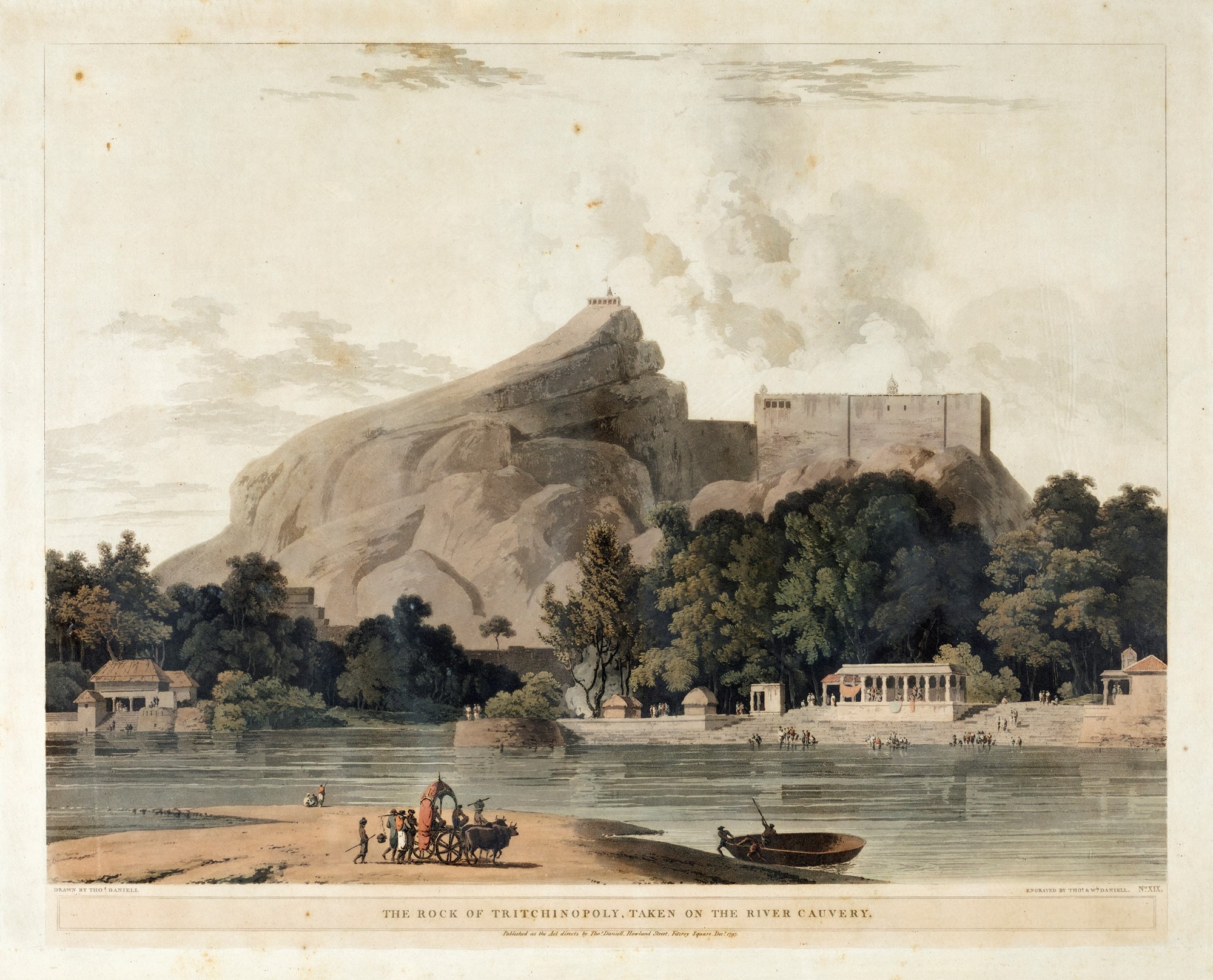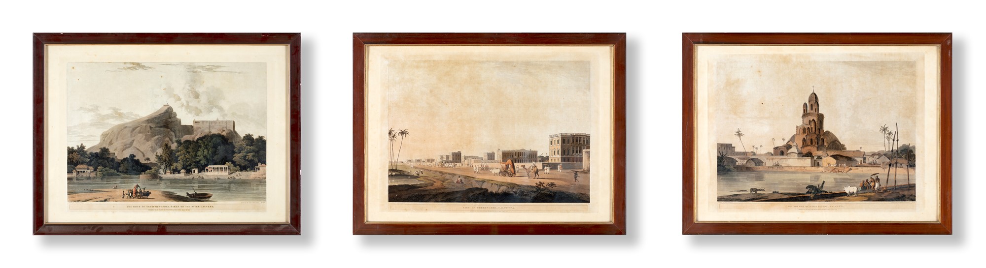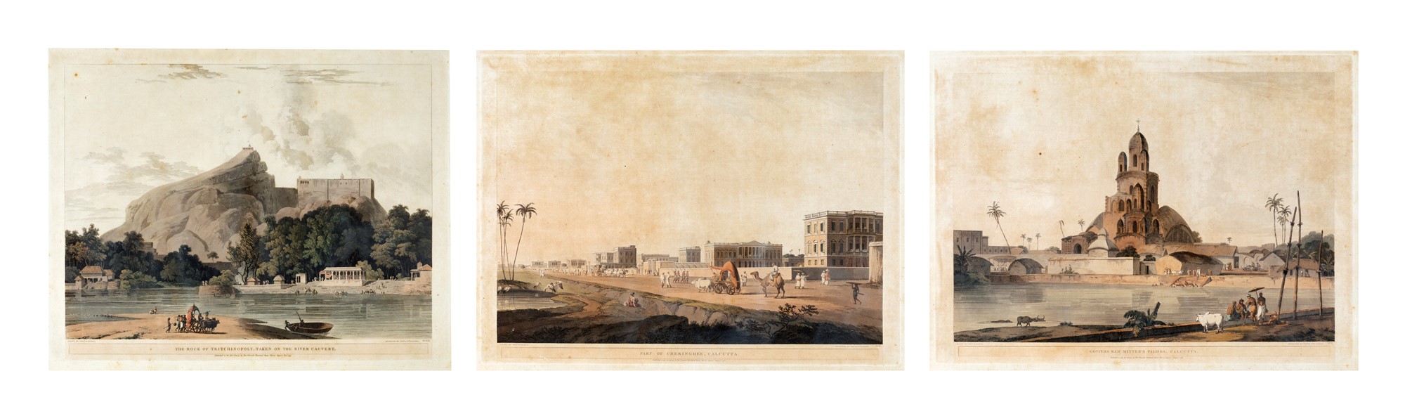 Tre vedute indiane tratte dall'opera Oriental Scenery di Thomas e William Daniell. litografia a colori cm 61x81