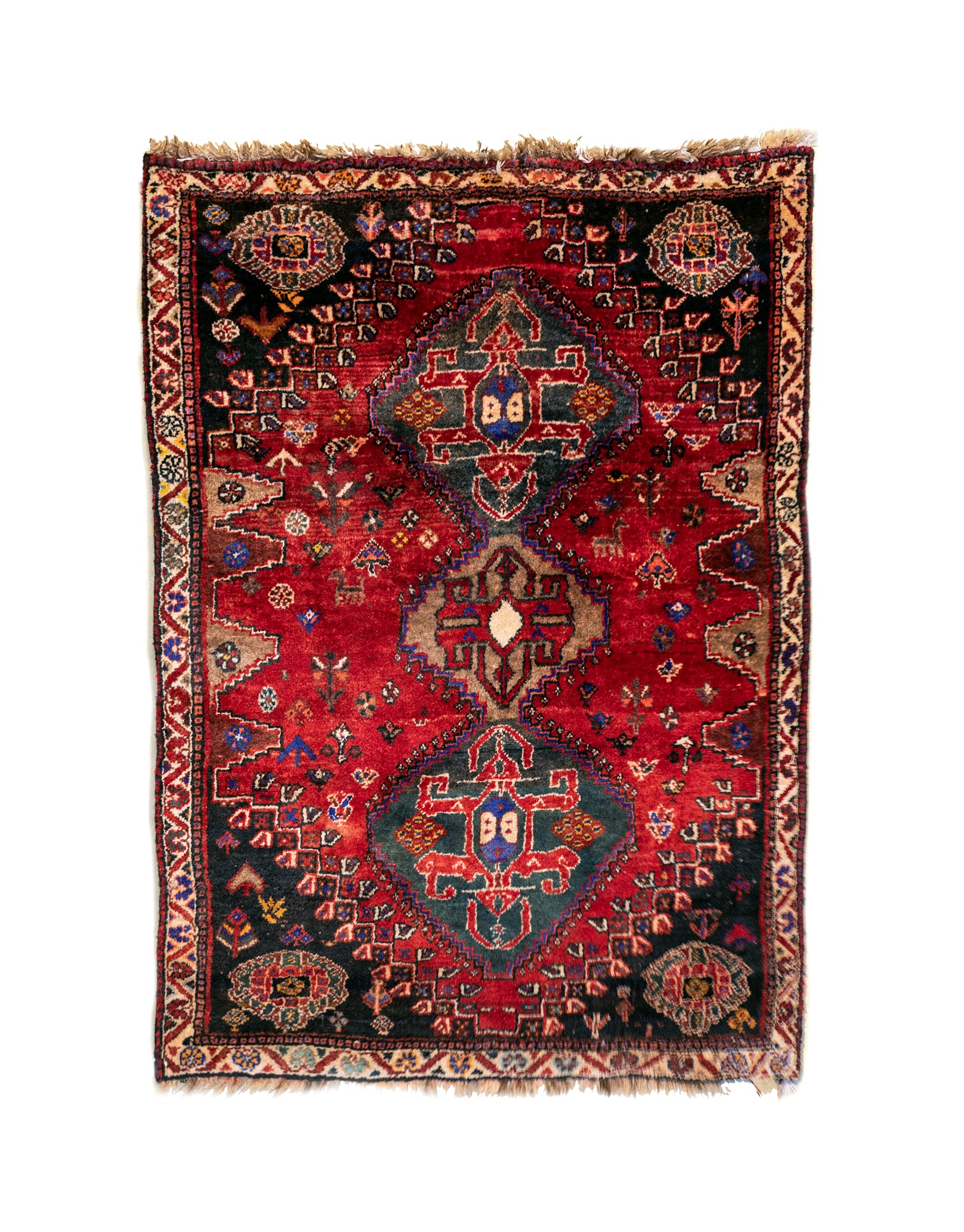 Tappeto fondo rosso con tre losanghe a vertici uniti; cantonali scuri entro piccola bordura bianca. cm 110x162