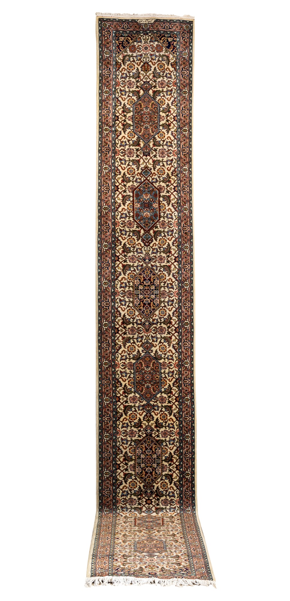 Lunga corsia fondo bianco con sette medaglioni esagonali in colonna circondati da fitto disegno a motivi floreali. cm 85x590