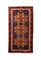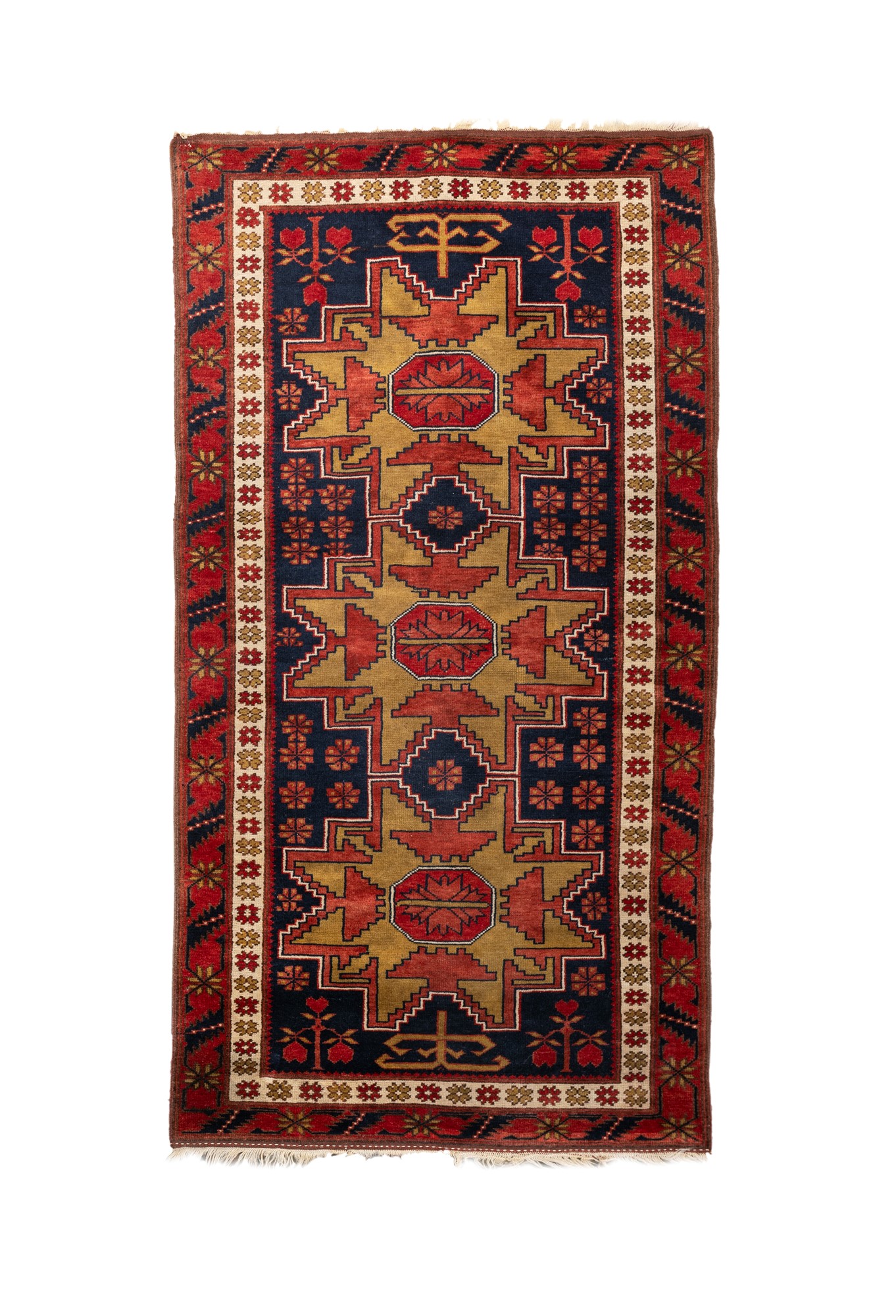 Tappeto fondo nero caratterizzato da tre motivi a stella contigui con disegno rosso su fondo senape; cornice principale racchiusa da una piccola bordura bianca percorsa da corolle. cm 100x205