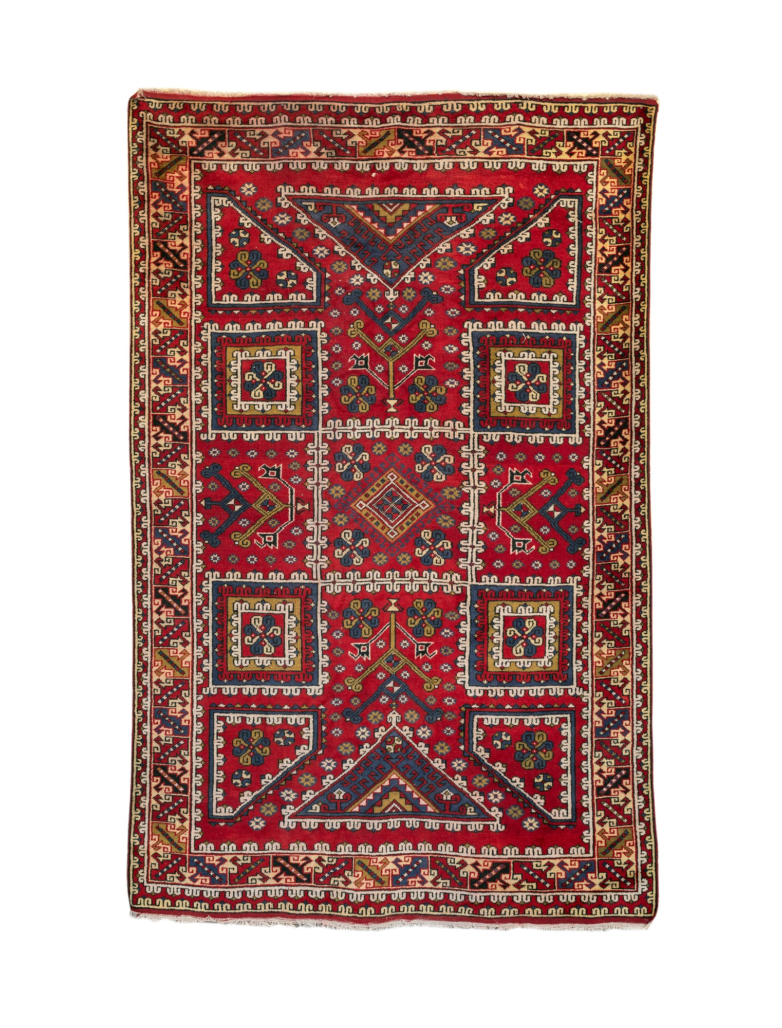 Tappeto fondo rosso a disegno naturalistico stilizzato disposto in forme geometriche. cm 206x323