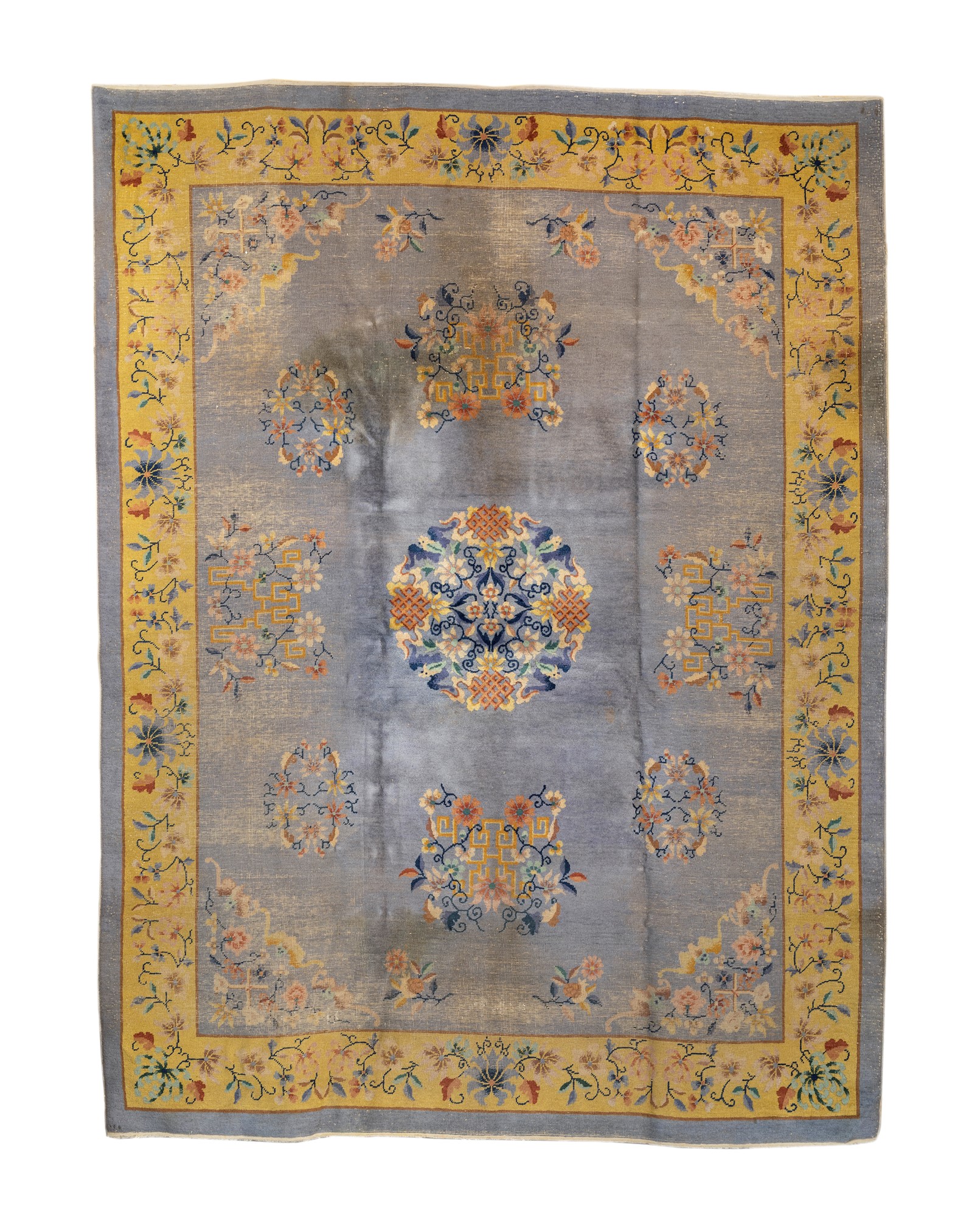 Tappeto cinese fondo celeste decorato da composizioni di fiori sparse nei toni dominanti del rosa, del bianco e del blu entro ampia cornice gialla. Consunto. cm 275x358