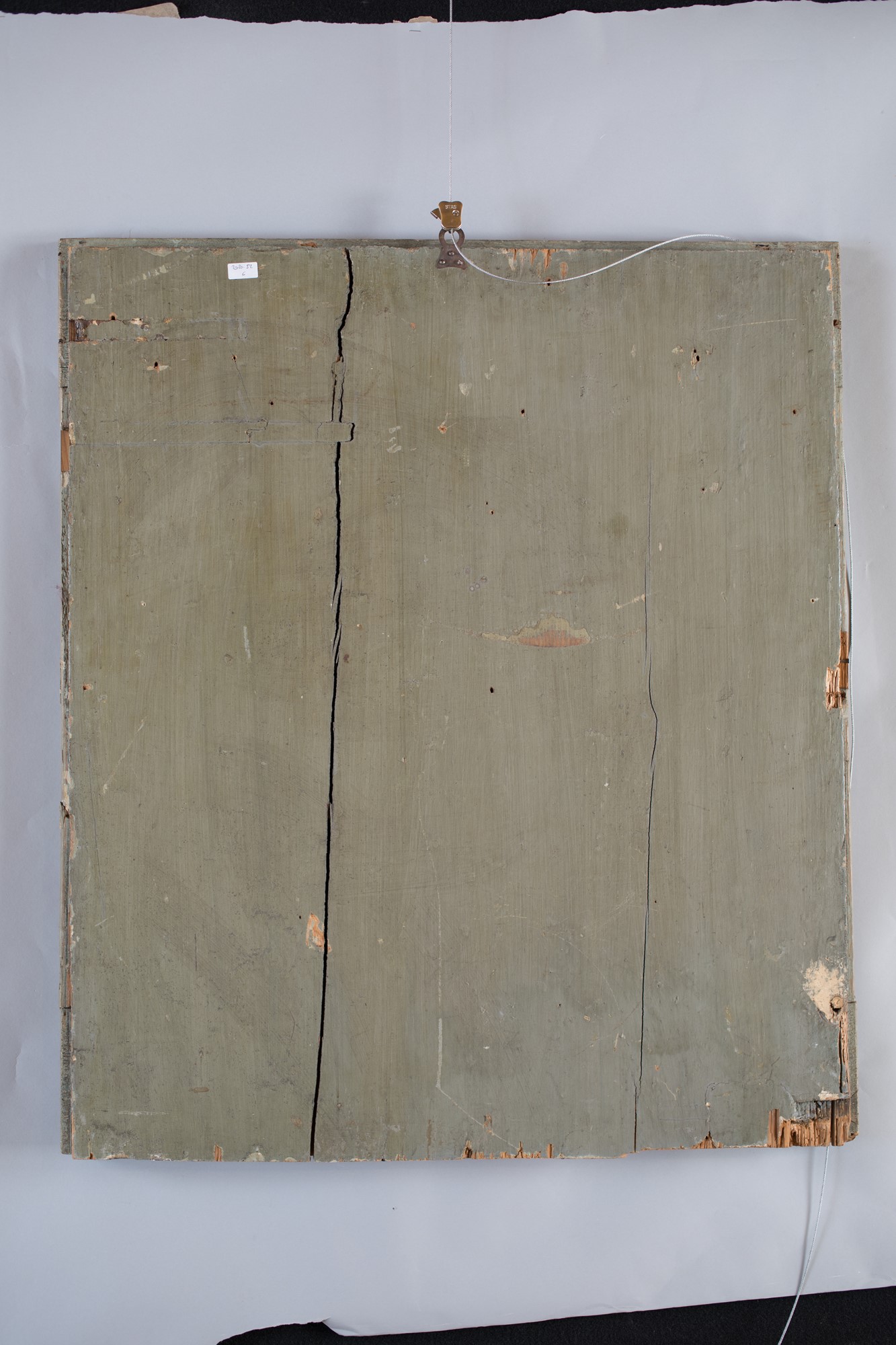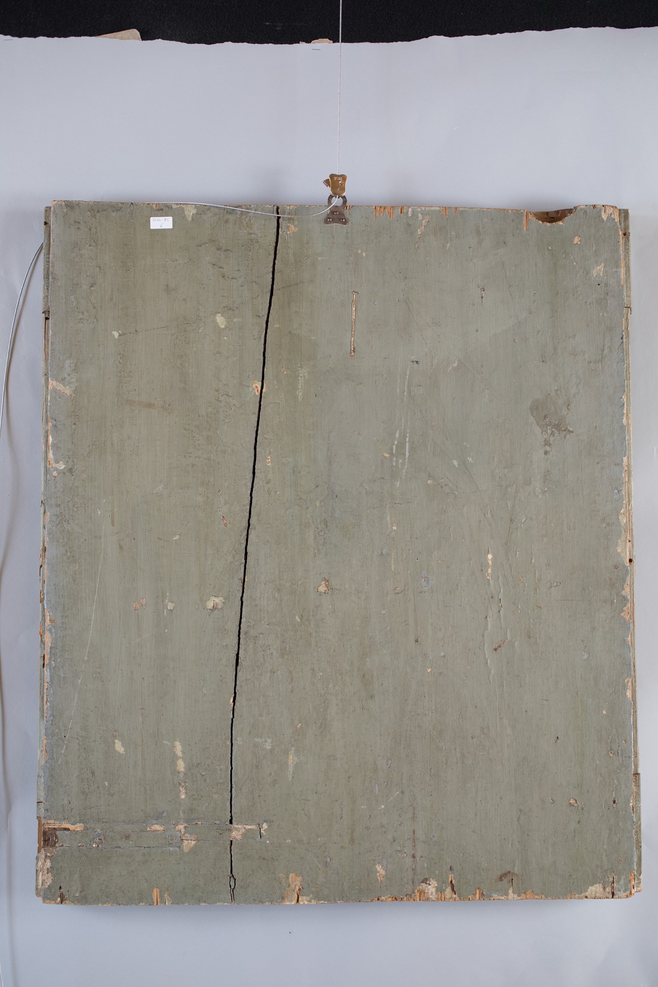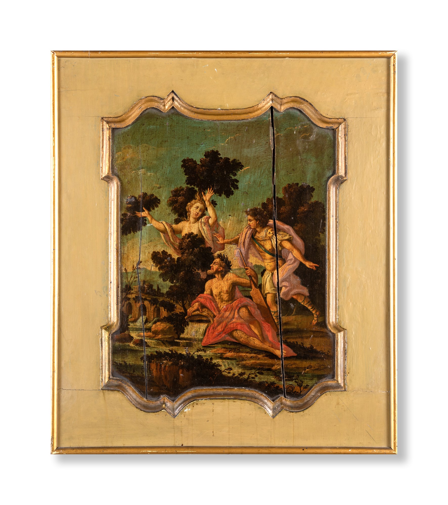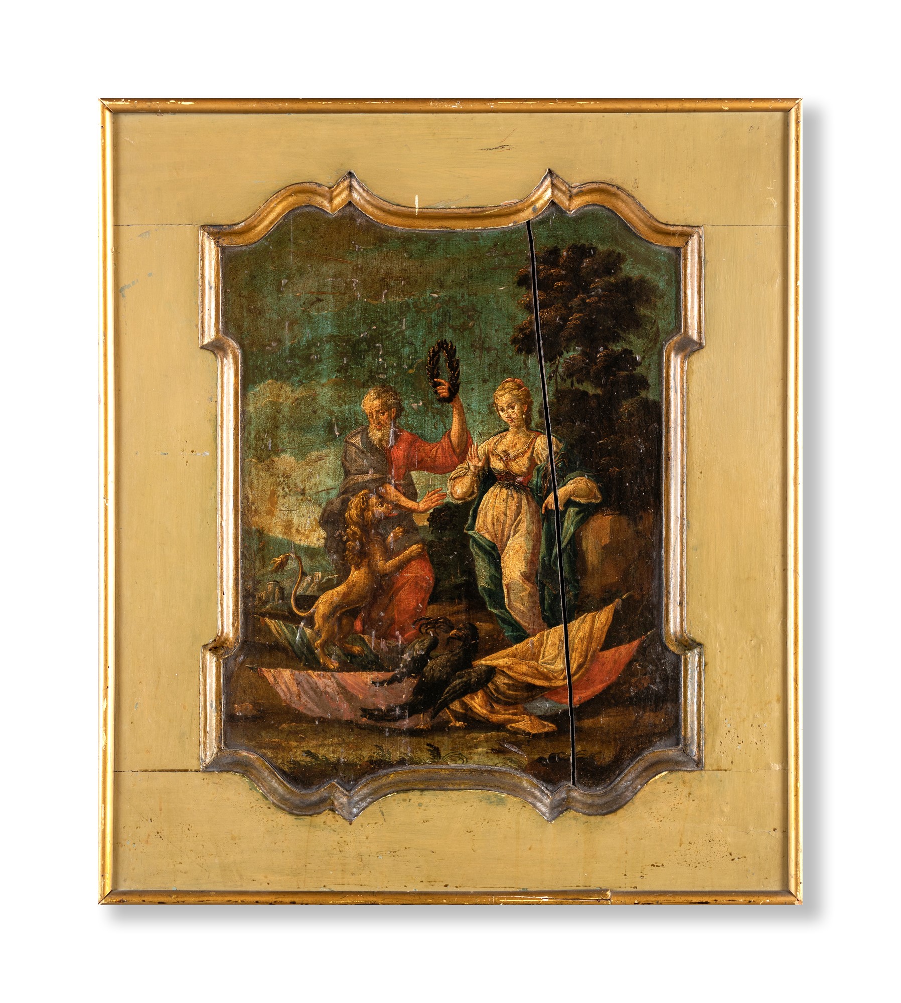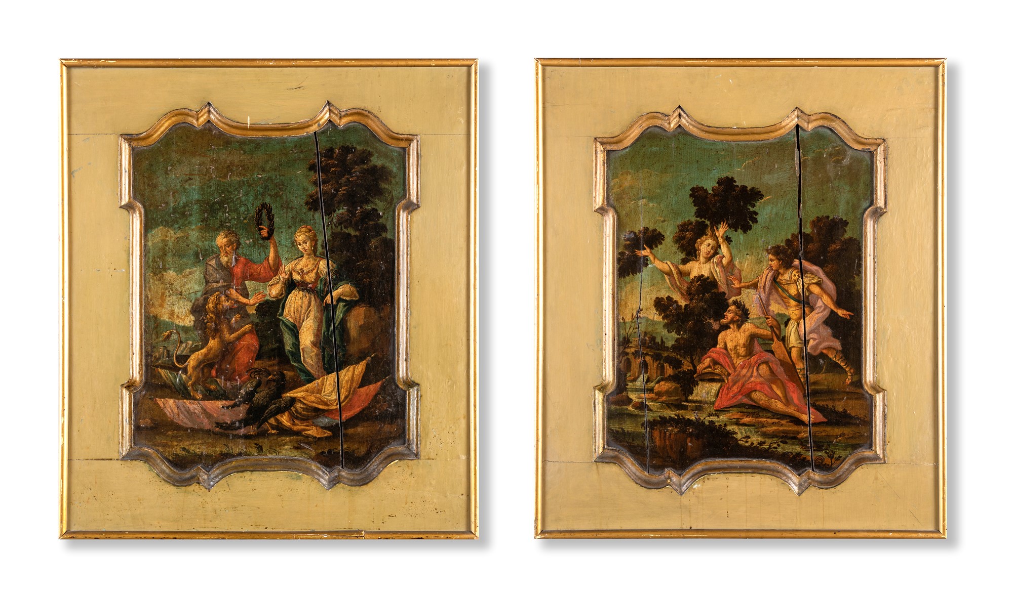 Pittore del XVIII secolo Coppia di pannelli, XIX secolo con specchiature sagomate dipinte in vivace policromia a raffigurare rispettivamente Apollo e Dafne e l'allegoria dell'unione matrimoniale. olio su tavola cm 88x76