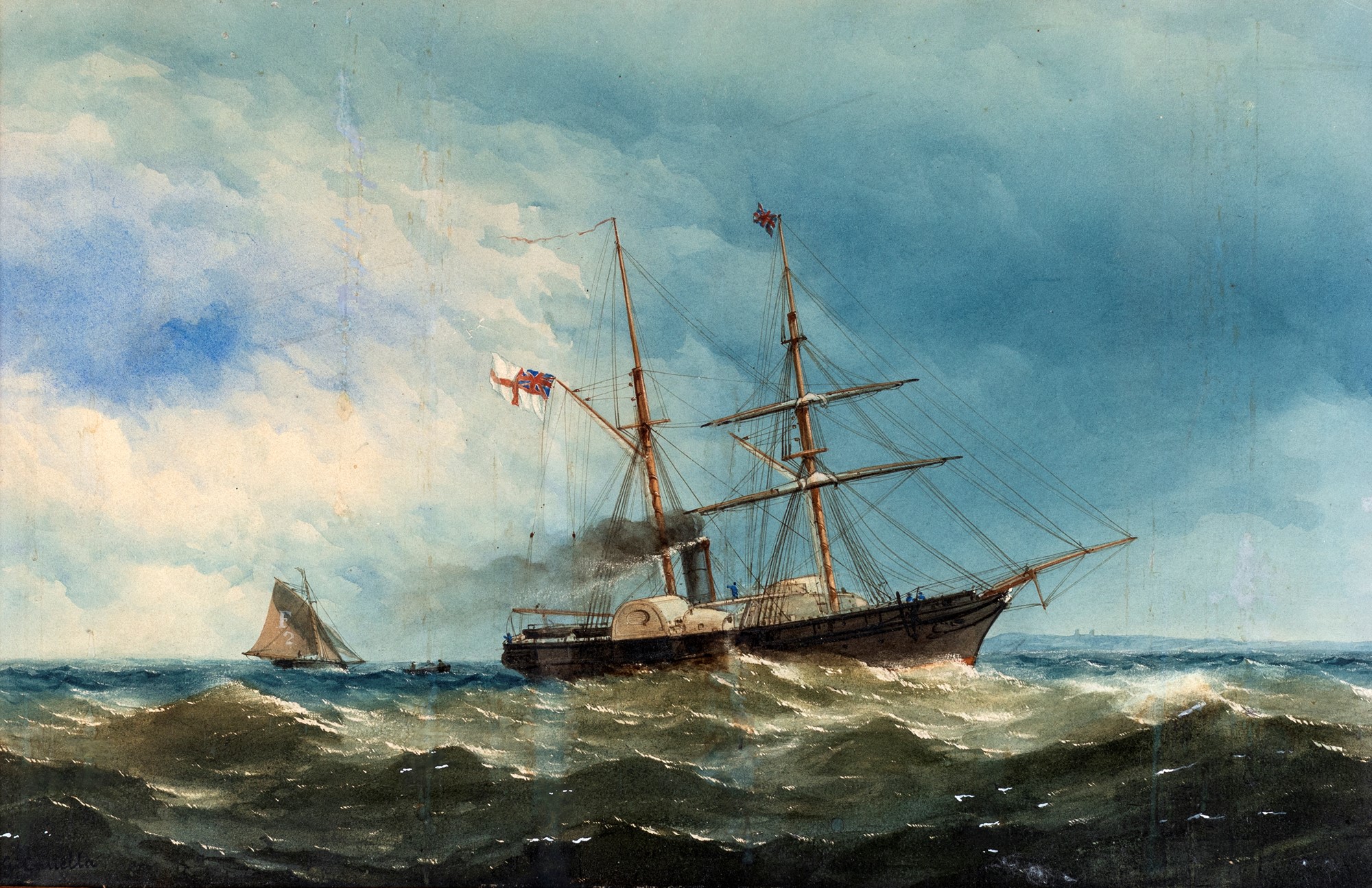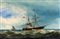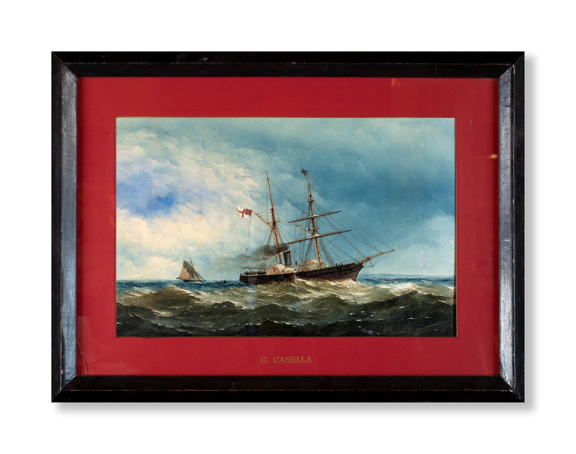 Giuseppe Canella Verona 1788-Firenze 1847 Marina con piroscafo della marina britannica con bandiera del Commonwealth Firmato C.Canella in basso a sinistra tempera su cartone cm 37x57