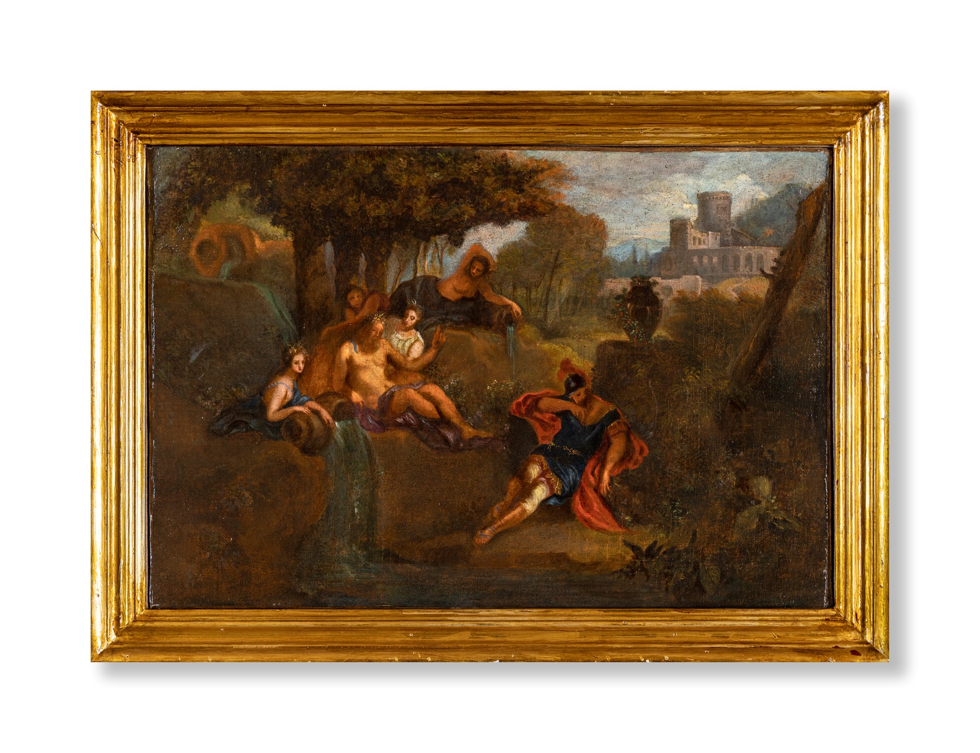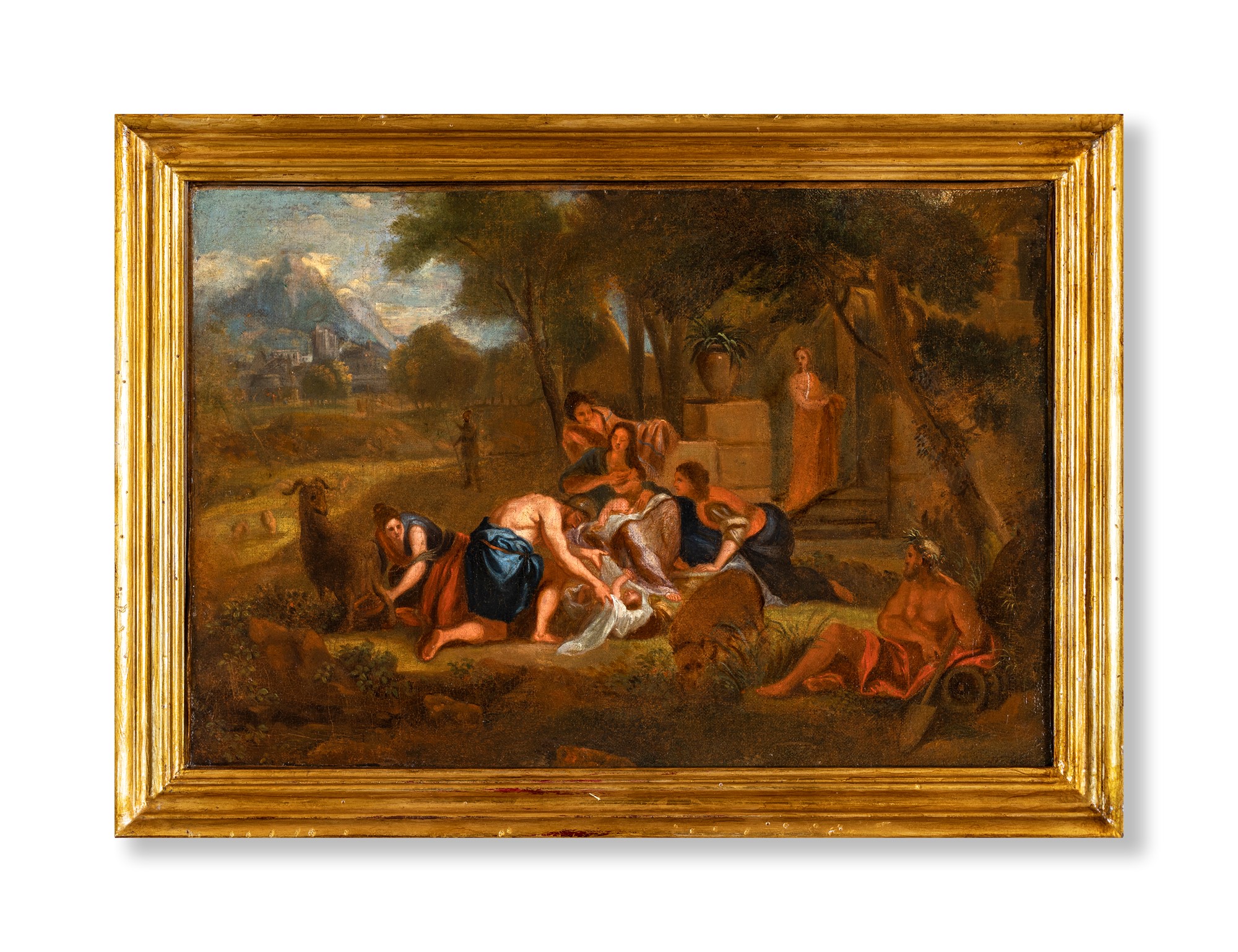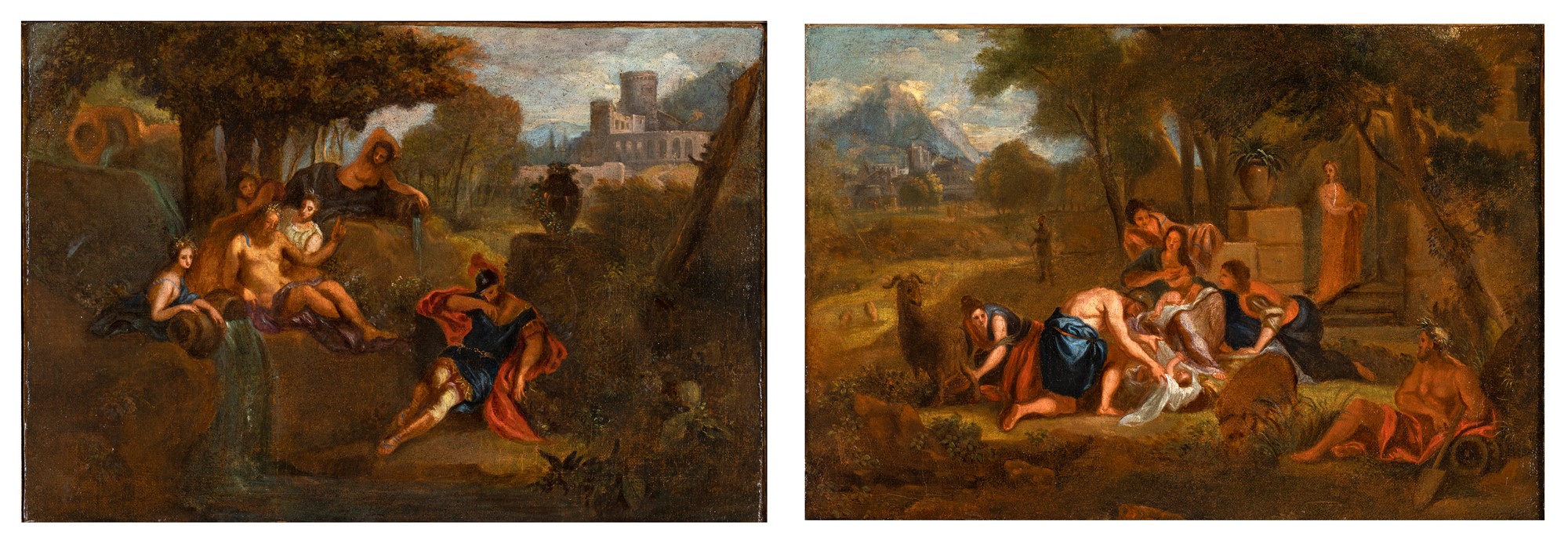 Nicolas Poussin (Cerchia) Villers 1594-Roma 1665 a) Il dio fluviale Tiberino appare in sogno ad Enea b) Ritrovamento di Mosé coppia di oli su tela cm 41x60