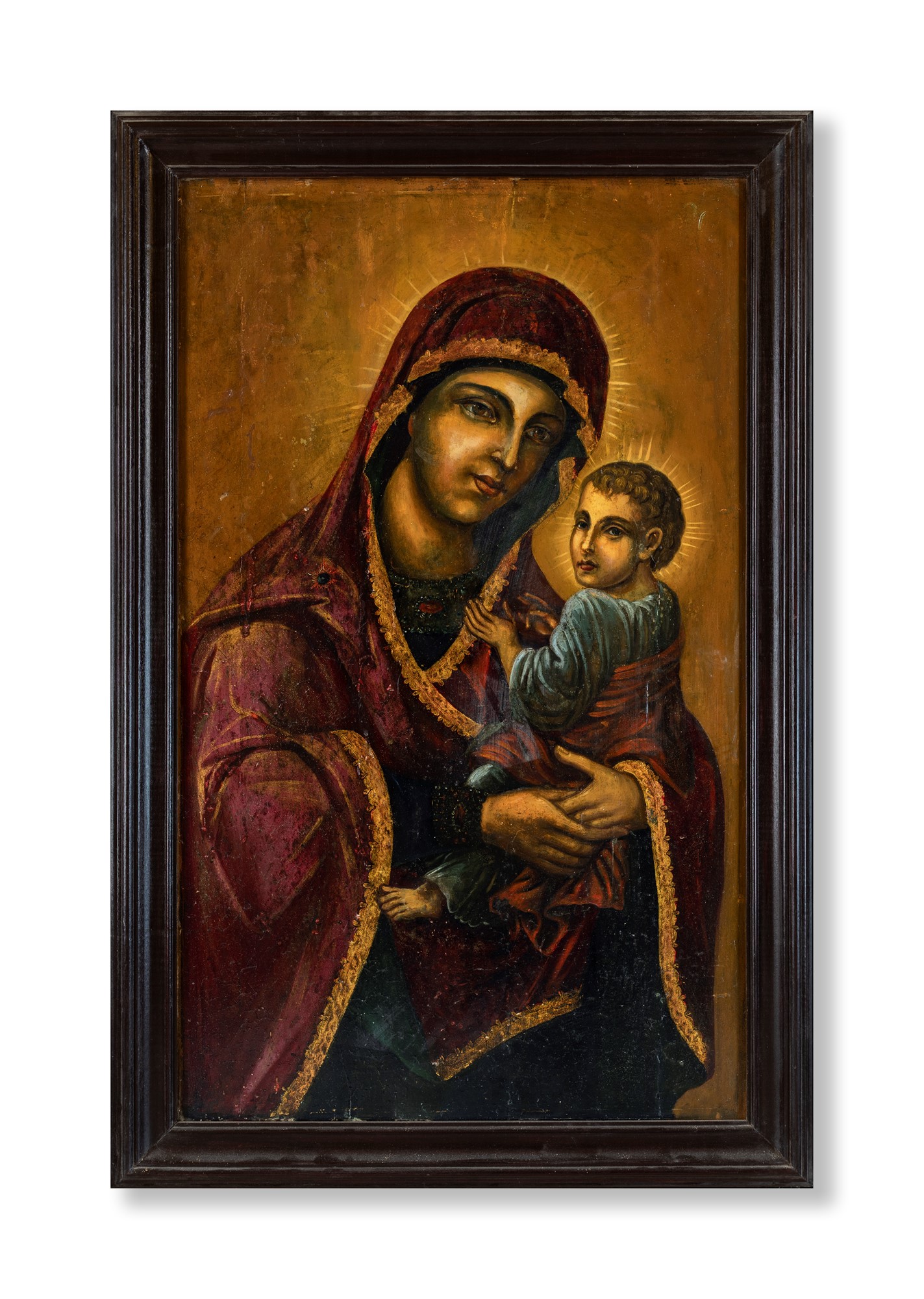 Icona, fine del XIX secolo raffigurante Madonna col Bambino. olio su tavola cm 103x68