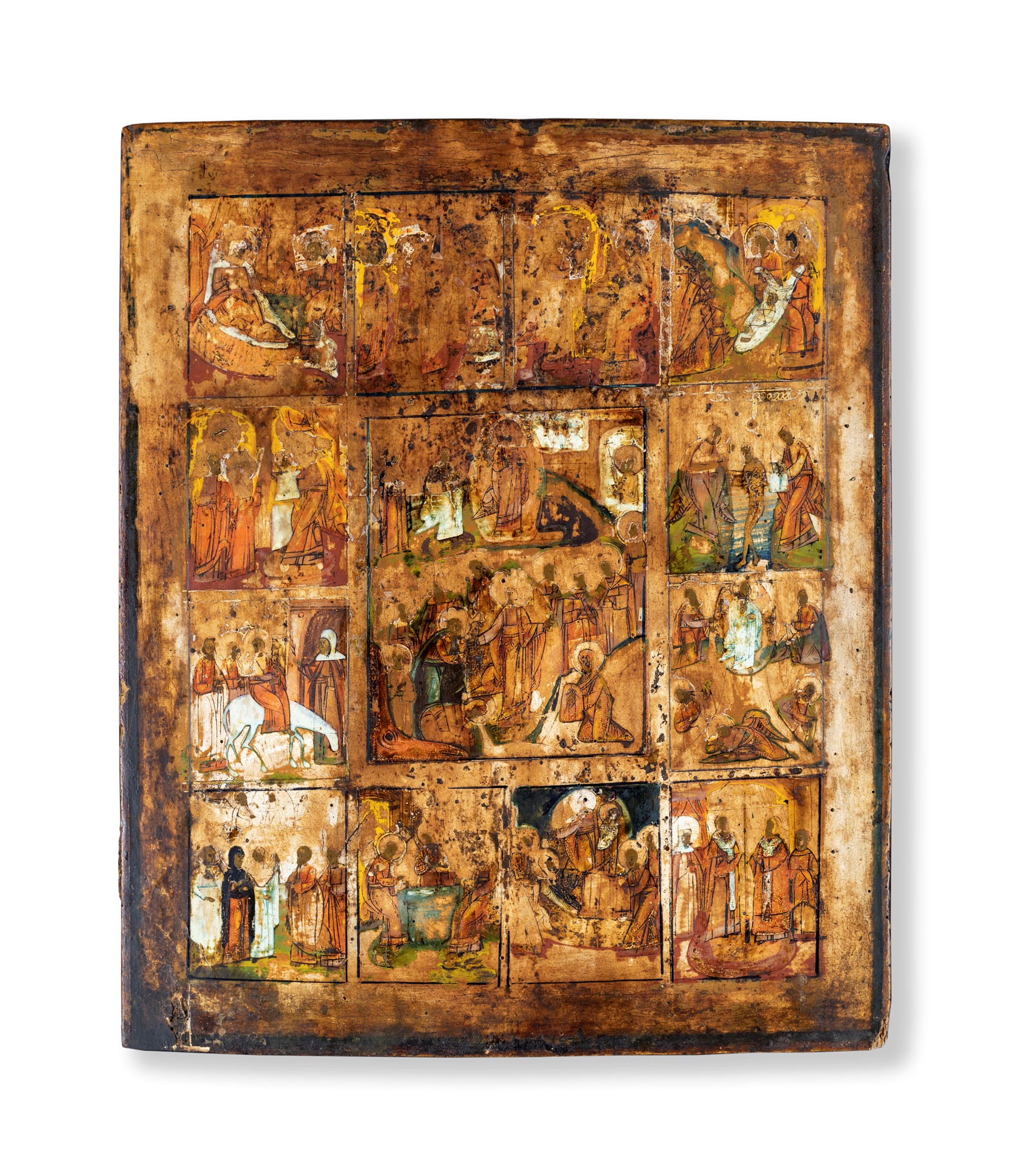 Antica icona, fine del XVIII secolo raffigurante le dodici grandi feste dell'anno liturgico della Chiesa Ortodossa. tempera su tavola cm 48x40