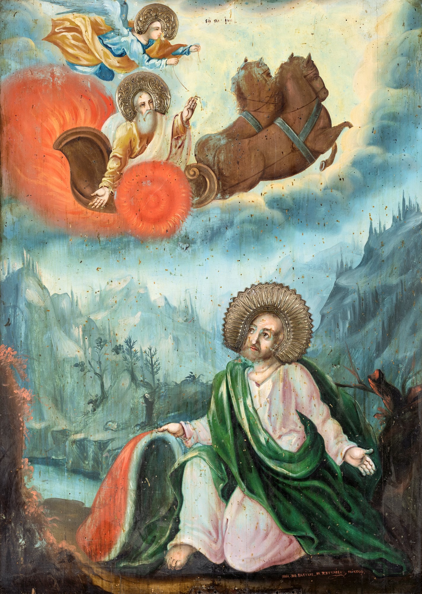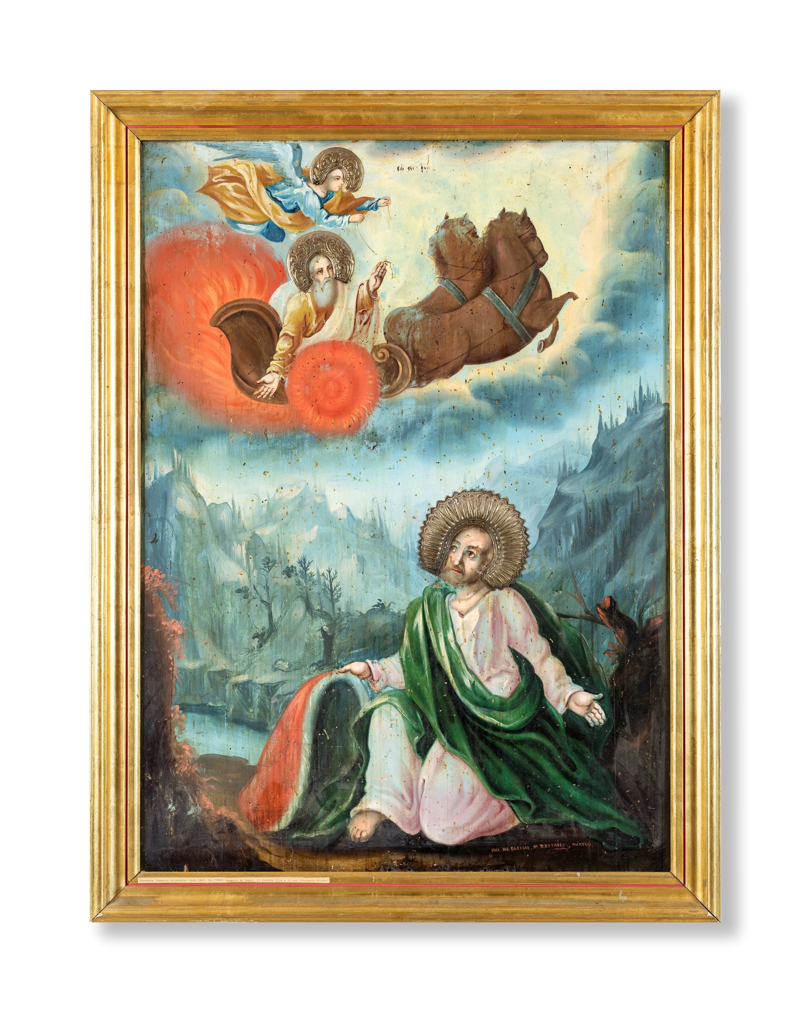 Grande icona, distretto di Costanza, seconda metà del XIX secolo raffigurante Sant'Elia e Sant'Eliseo. Al verso ex voto. Datata 1861. olio su tavola cm 110x80