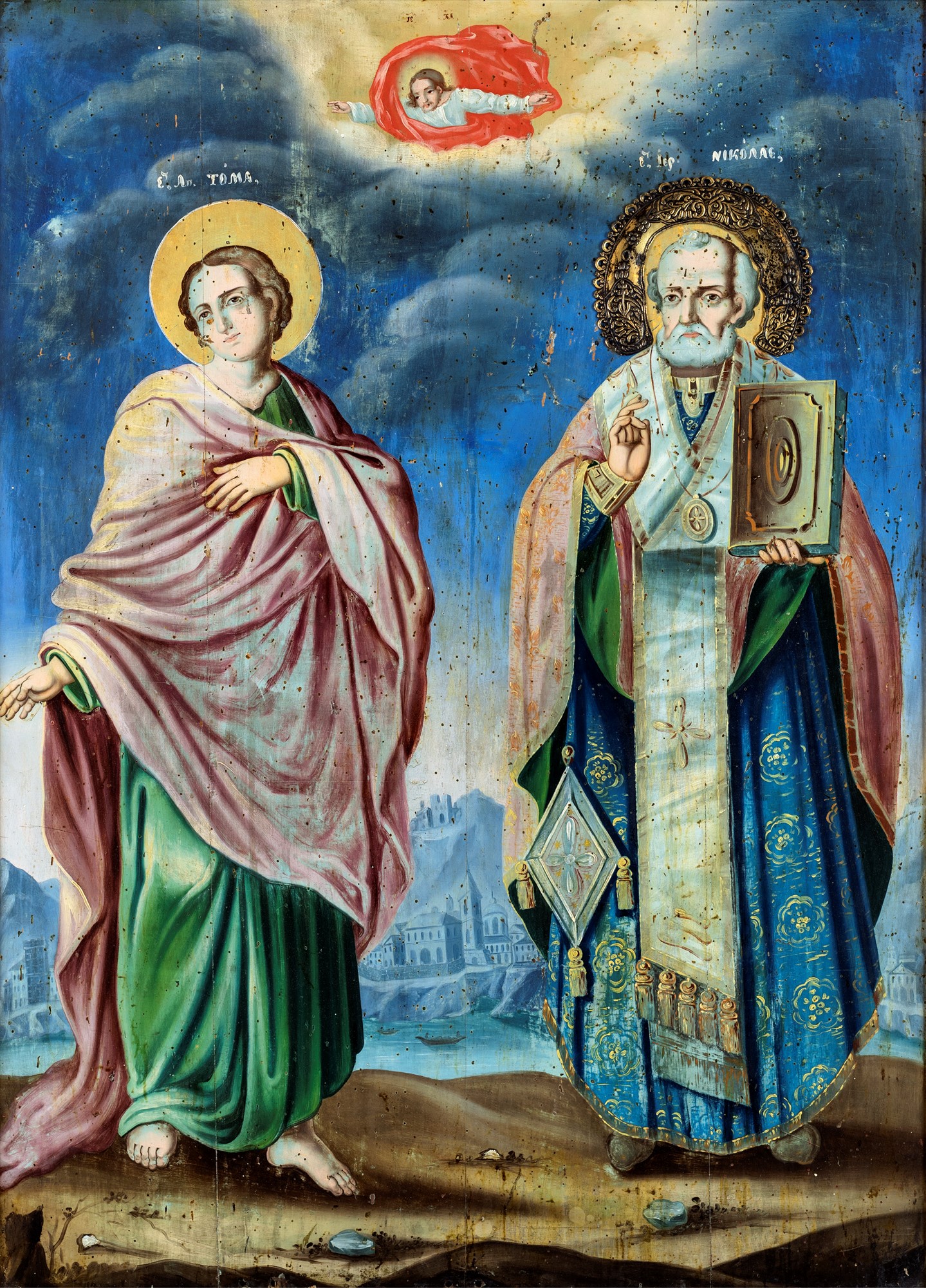 Grande icona, distretto di Costanza seconda metà del XIX secolo raffigurante San Tommaso e San Nicola. olio su tavola cm 110x80