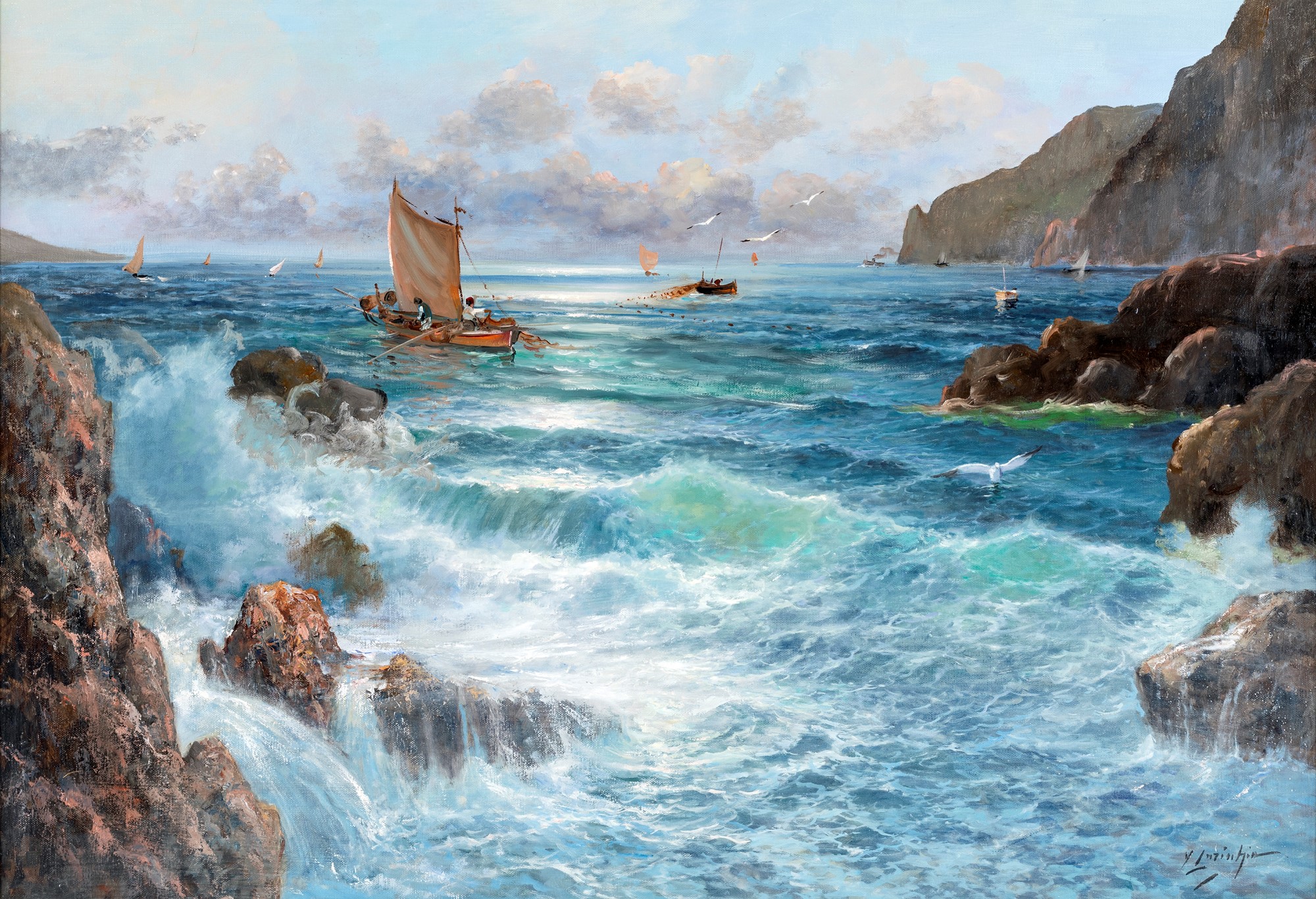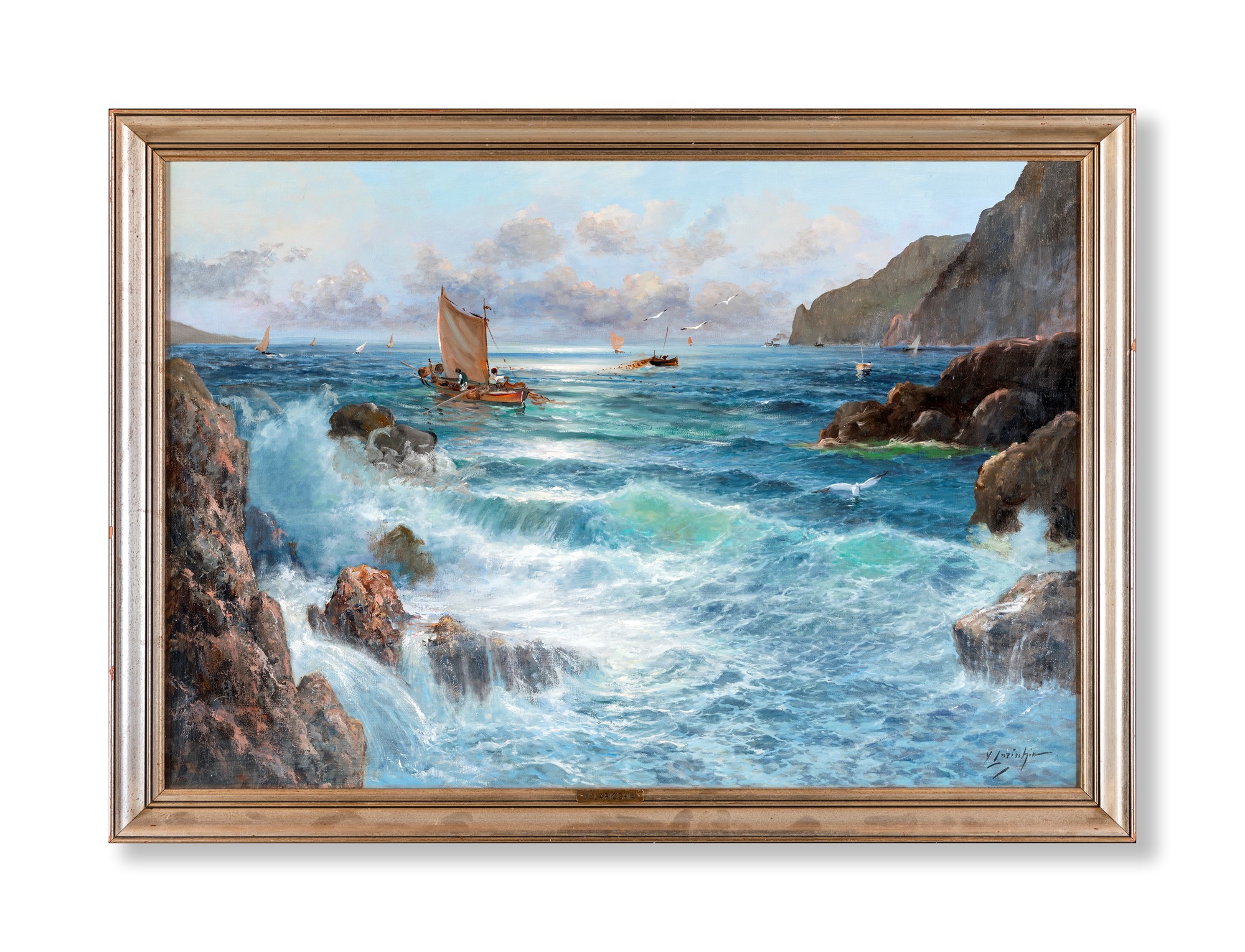 Vincenzo Laricchia Napoli 1940 Mareggiata a Capri Firmato in basso a destra. Titolo e firma al verso. olio su tela cm 66x96