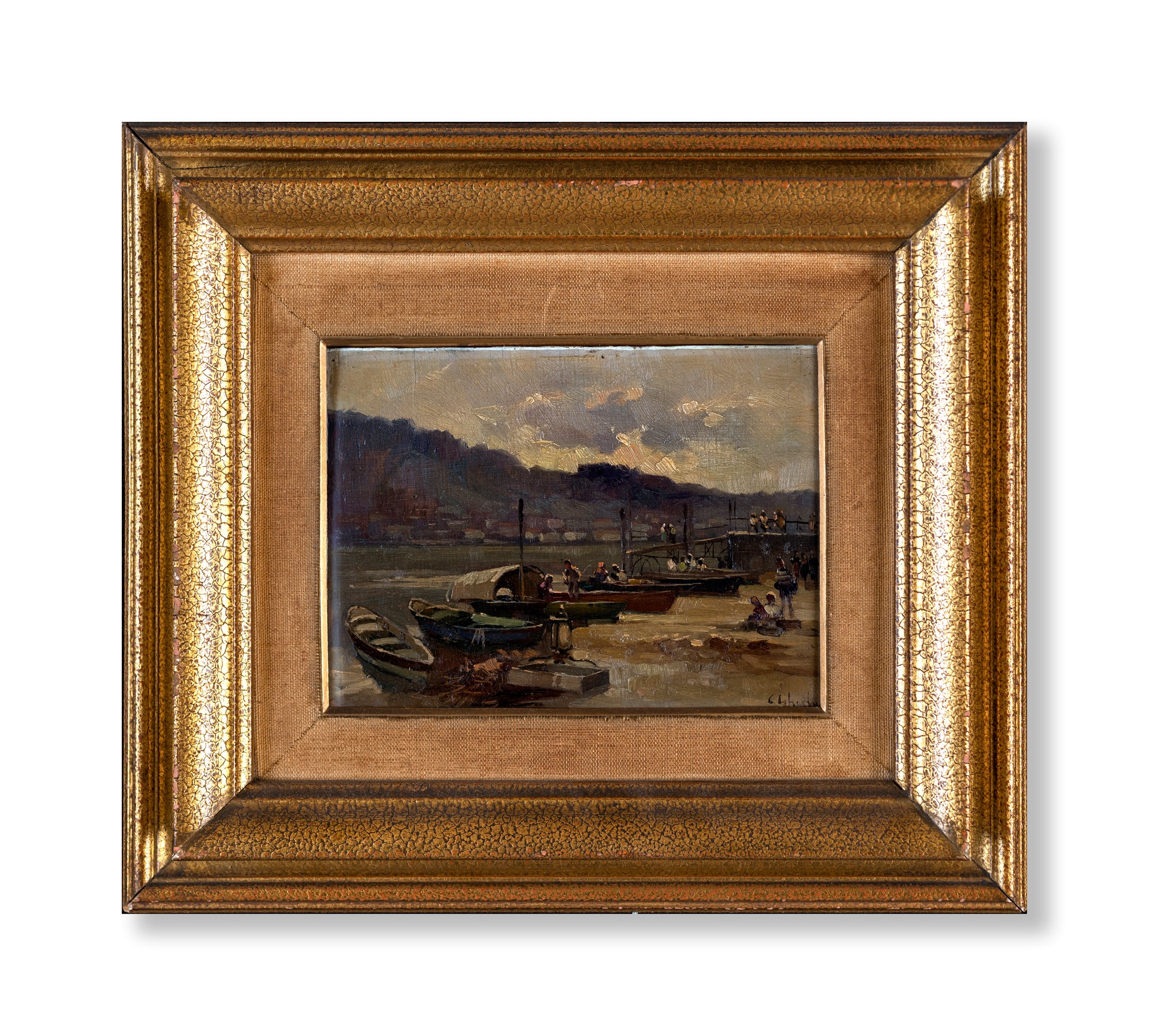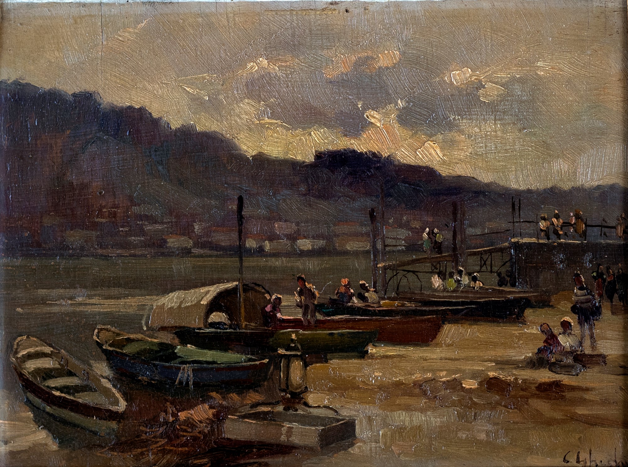 Cesare Gheduzzi 1894-1944 Barche con pescatori Firmato in basso a destra C. Gheduzzi olio su compensato cm 13x18