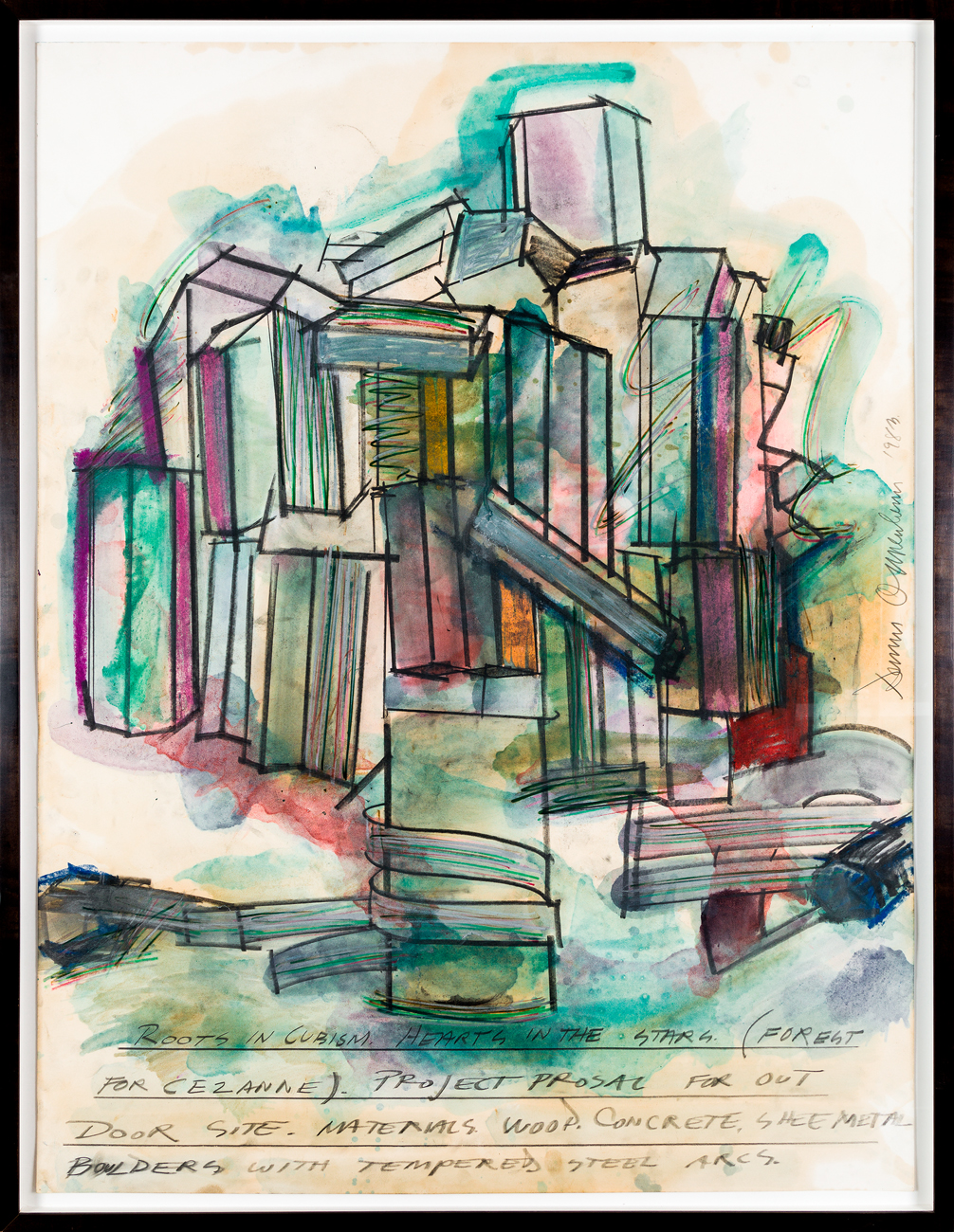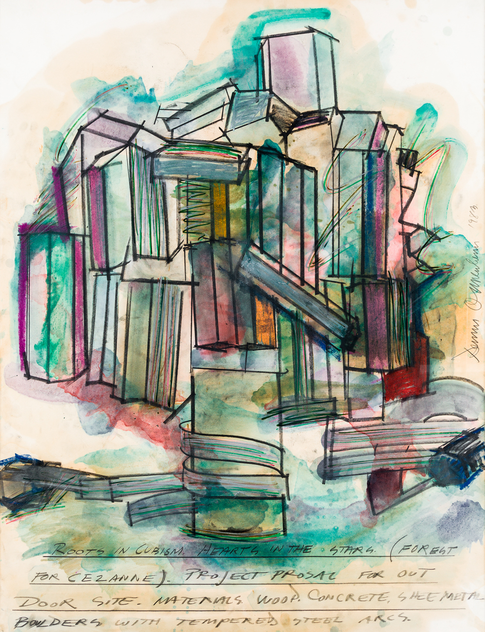 DENNIS OPPENHEIM (1938-2011) - Roots in Cubism. Hearts in the Stars. (Forest for Cezanne). Project proposal for outdoor site.Materials: wood, concrete, sheet metal, boulders with tempered steel arcs, 1983
