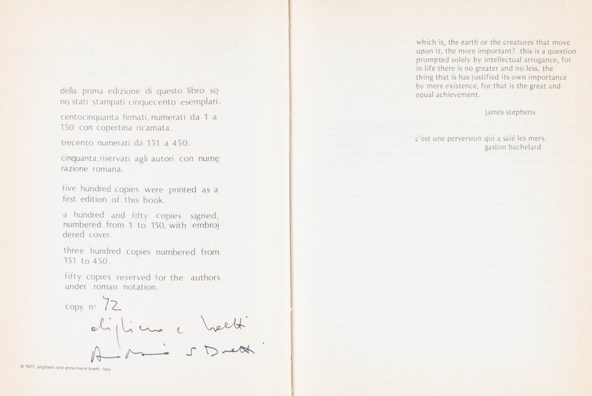 Firmato nel colophon: Alighiero e Boetti e Anne Marie S. Boetti