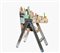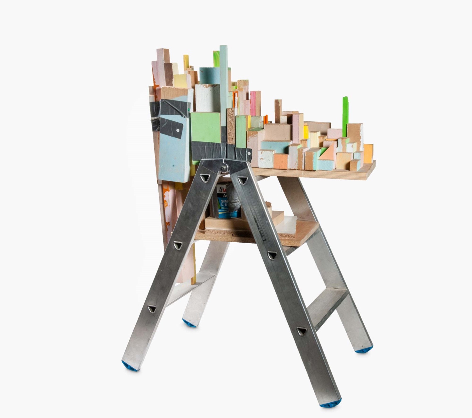 legno dipinto, nastro adesivo, puntine da disegno, lattina di vernice e cartone su scala di metallo