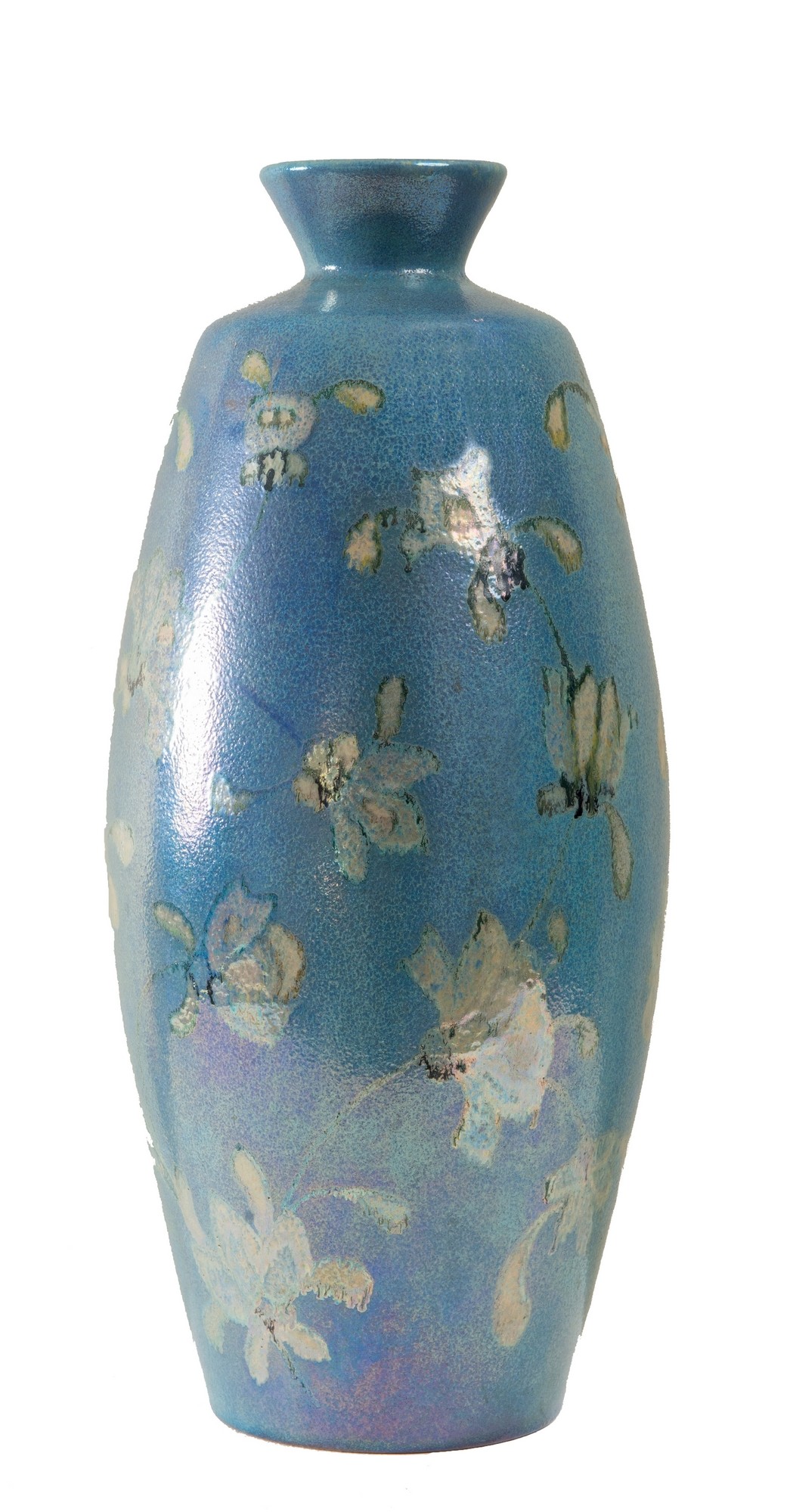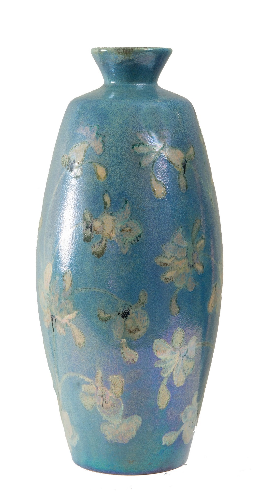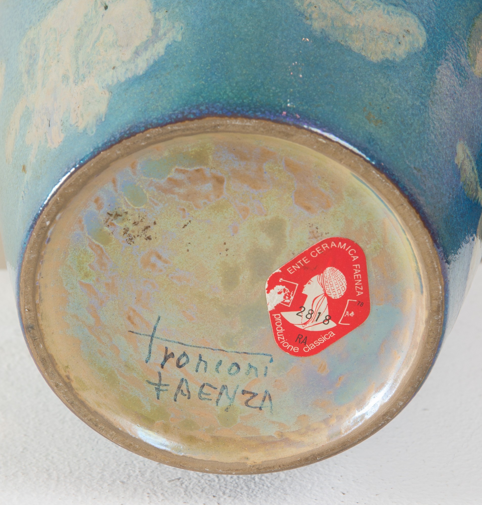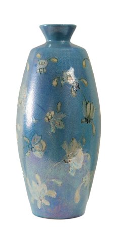 GIORDANO TRONCONI (Faenza, 1932). Vaso in maiolica a lustro, decorazione di ramage fogliacei su fondo azzurro. Sotto la base firma ed etichetta dell’Ente Ceramica Faenza. Cm 41.