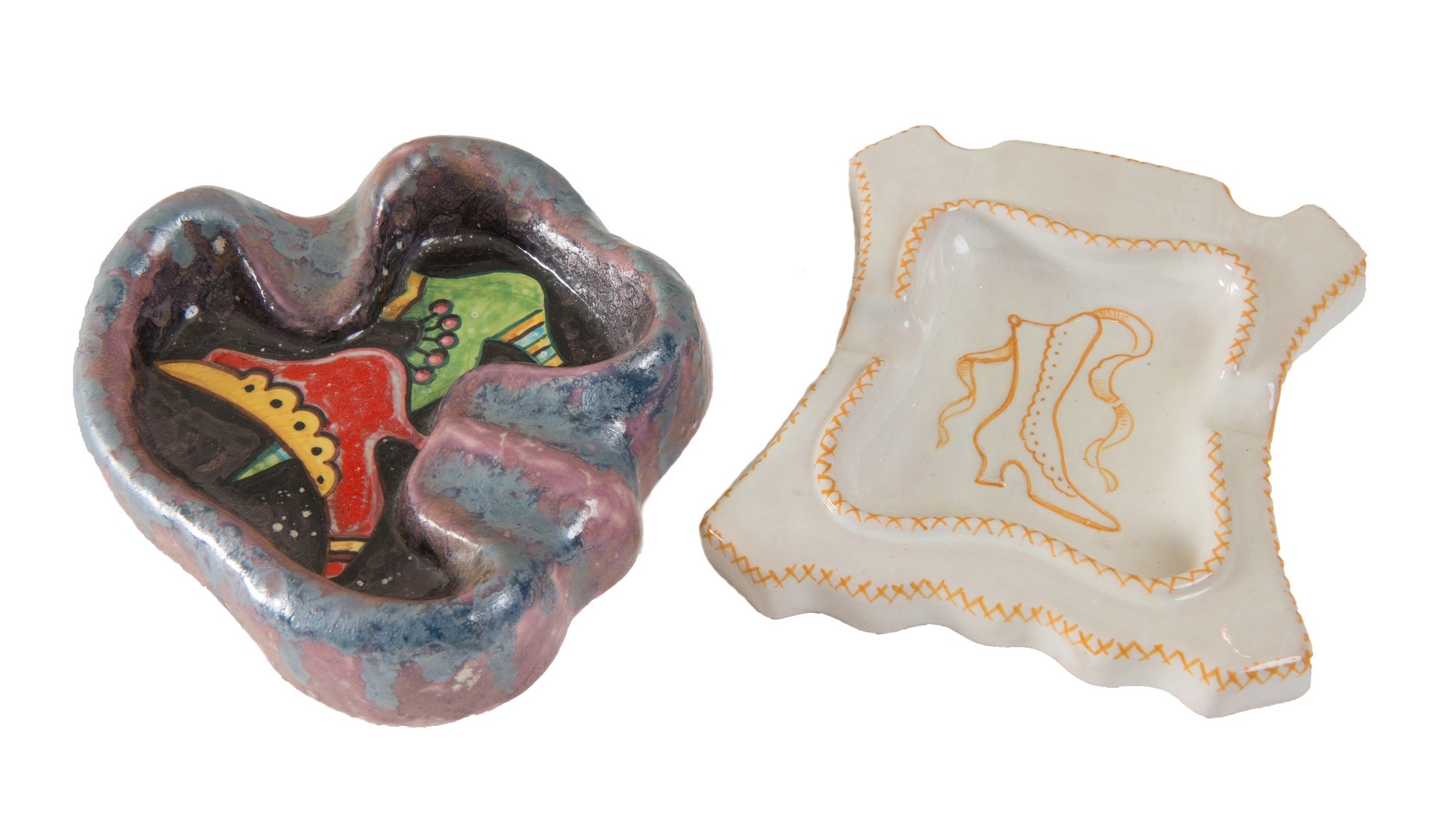 A. MINGHETTI, XX secolo. Coppia di posaceneri in ceramica smaltata, a firma “A. Minghetti”. 1: “Stivale”. Posacenere in ceramica smaltata. Firmato sotto la base. Cm 12,5x11. 2: “Stivali”. Posacenere in ceramica smaltata. Firmato sotto la base. Cm 12,5x12.