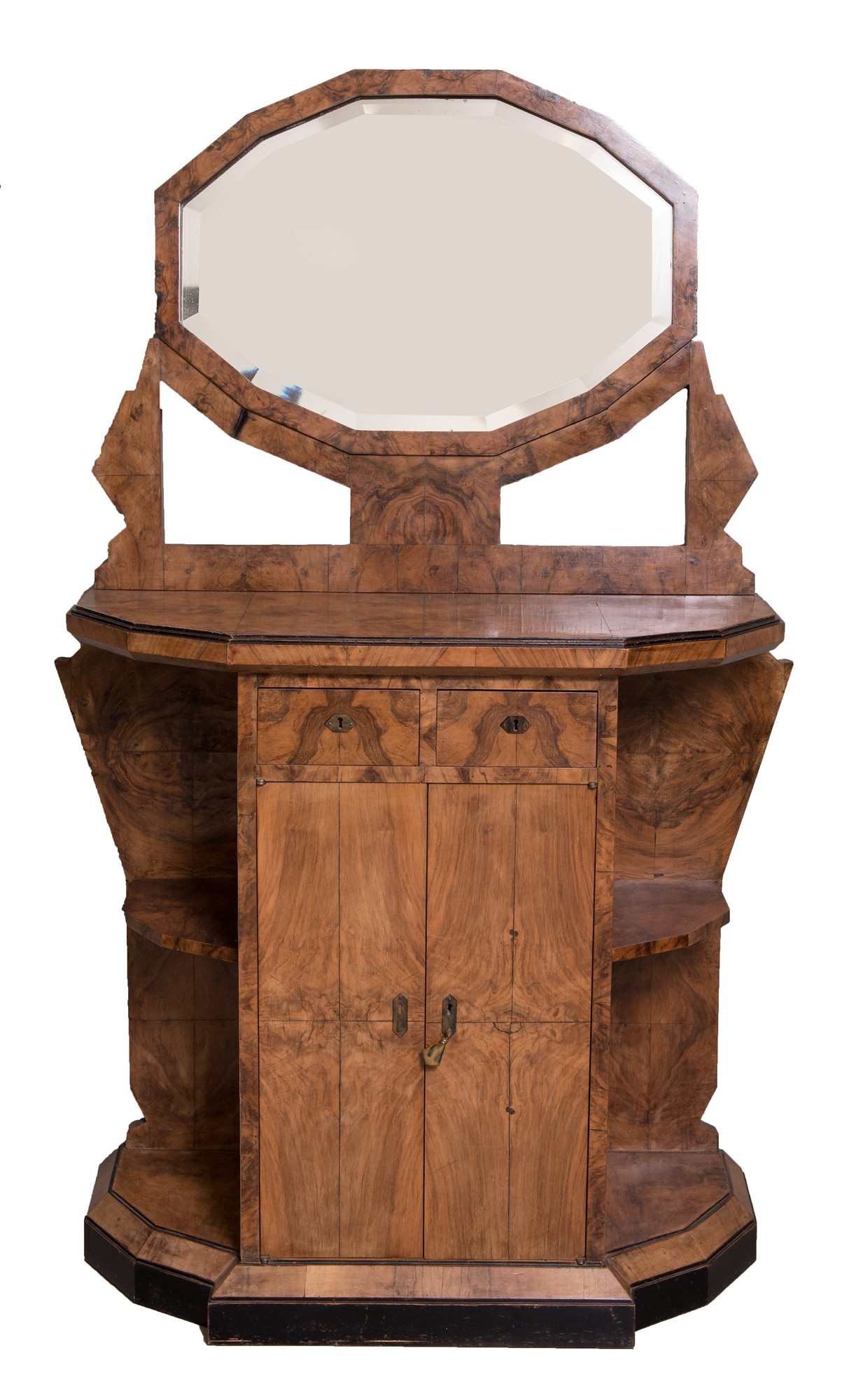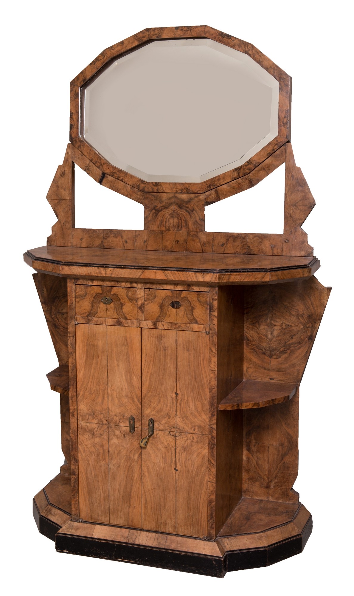 CREDENZA ART DECO’ CON SPECCHIERA, inizio XX secolo. Credenza in radica di noce, composta da un piano di appoggio su cui vi è montata una specchiera, due ante centrali con un ripiano estraibile, due cassetti centrali e una mensola posizionata in entrambe le nicchie laterali, Cm 168x110x40.