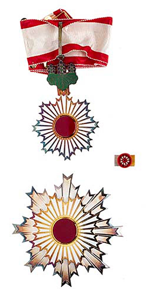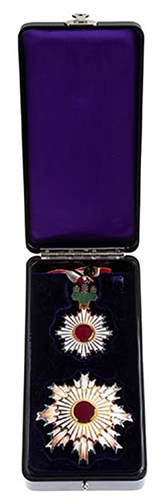 GIAPPONE, ORDINE DEL SOL LEVANTE, INSEGNA DI GRAN CROCE CON PLACCA FASCIA E PENDENTE, IN ASTUCCIO DI LACCA CON DIPLOMA DI CONCESSIONE.