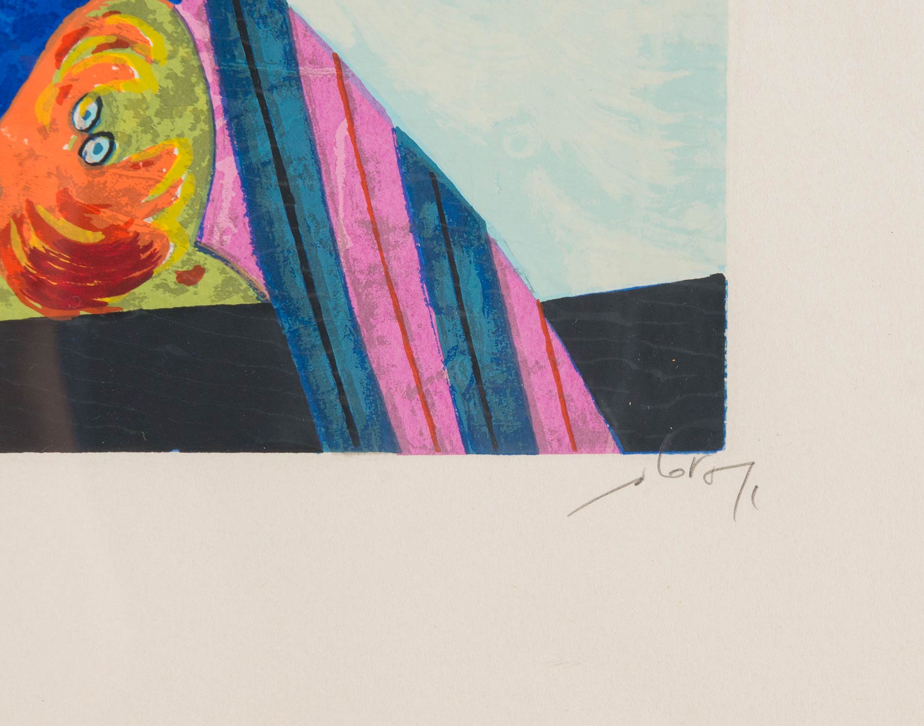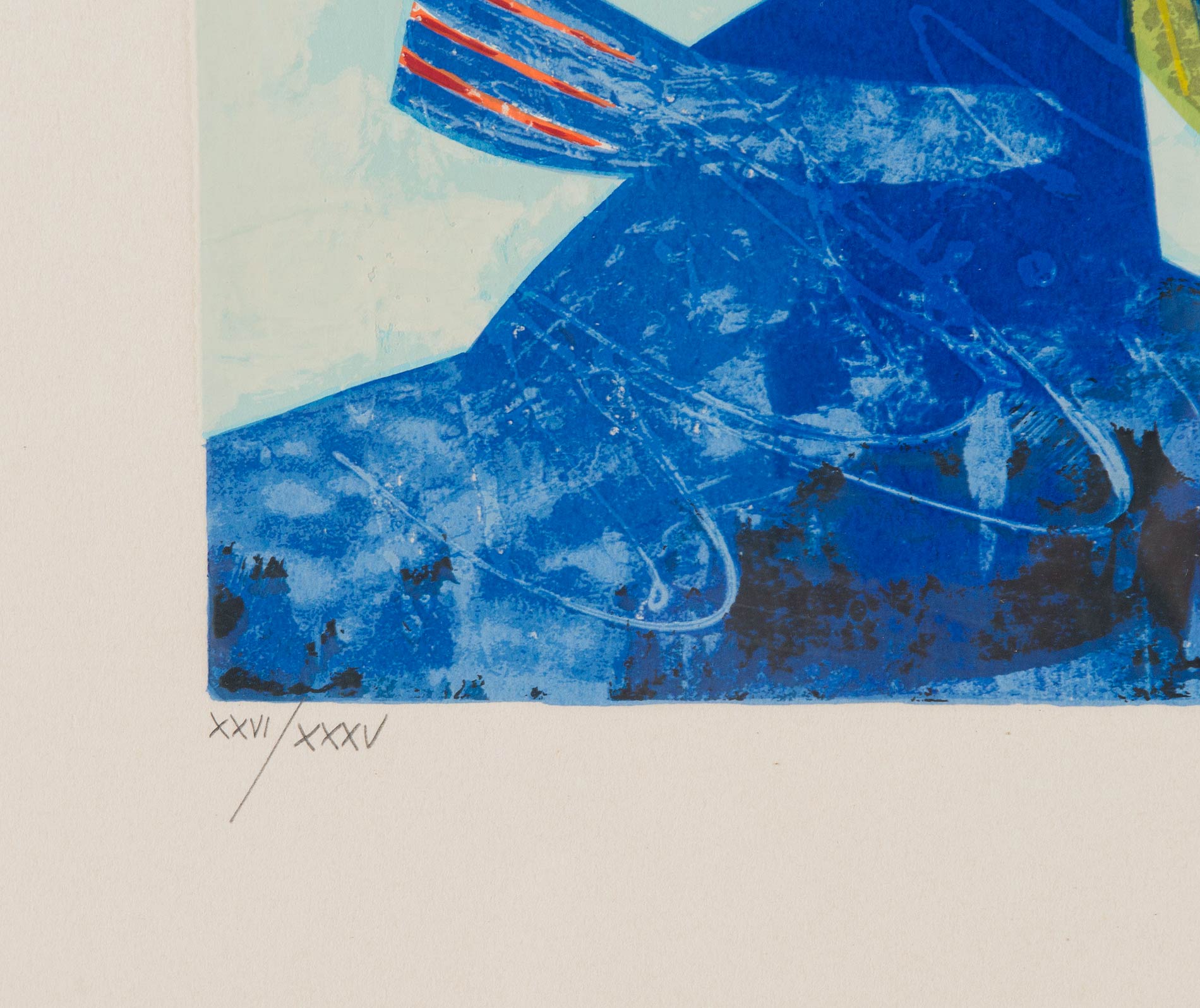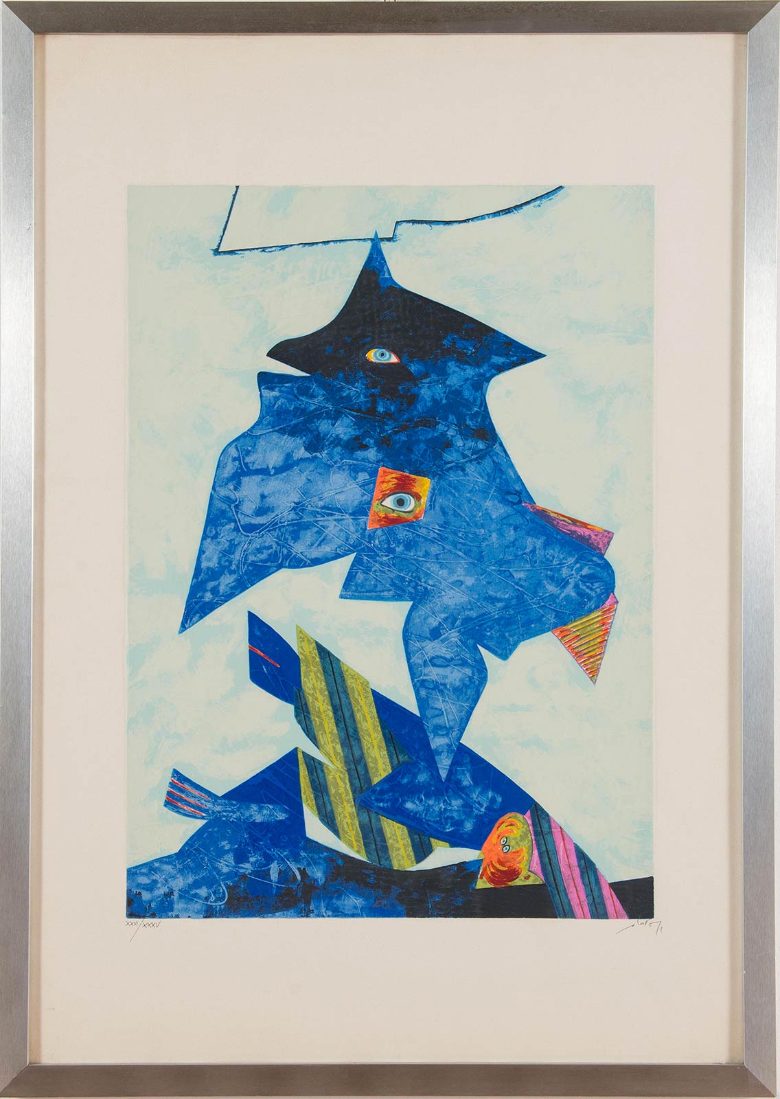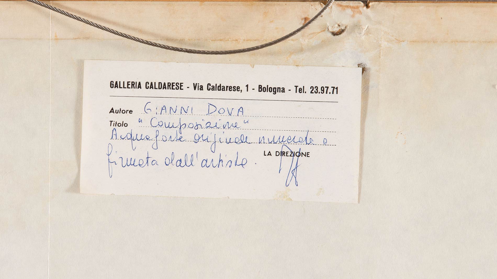 Gianni Dova (Roma 1925 - Pisa 1991), “Composizione”. Acquaforte a colori su carta, firmata in basso a destra Dova, numero di tiratura in basso a sinistra XXVI/XXXV, Foglio H cm 100x70 - Lastra H cm 70x50 Al retro reca etichetta Galleria Caldarese – Bologna.