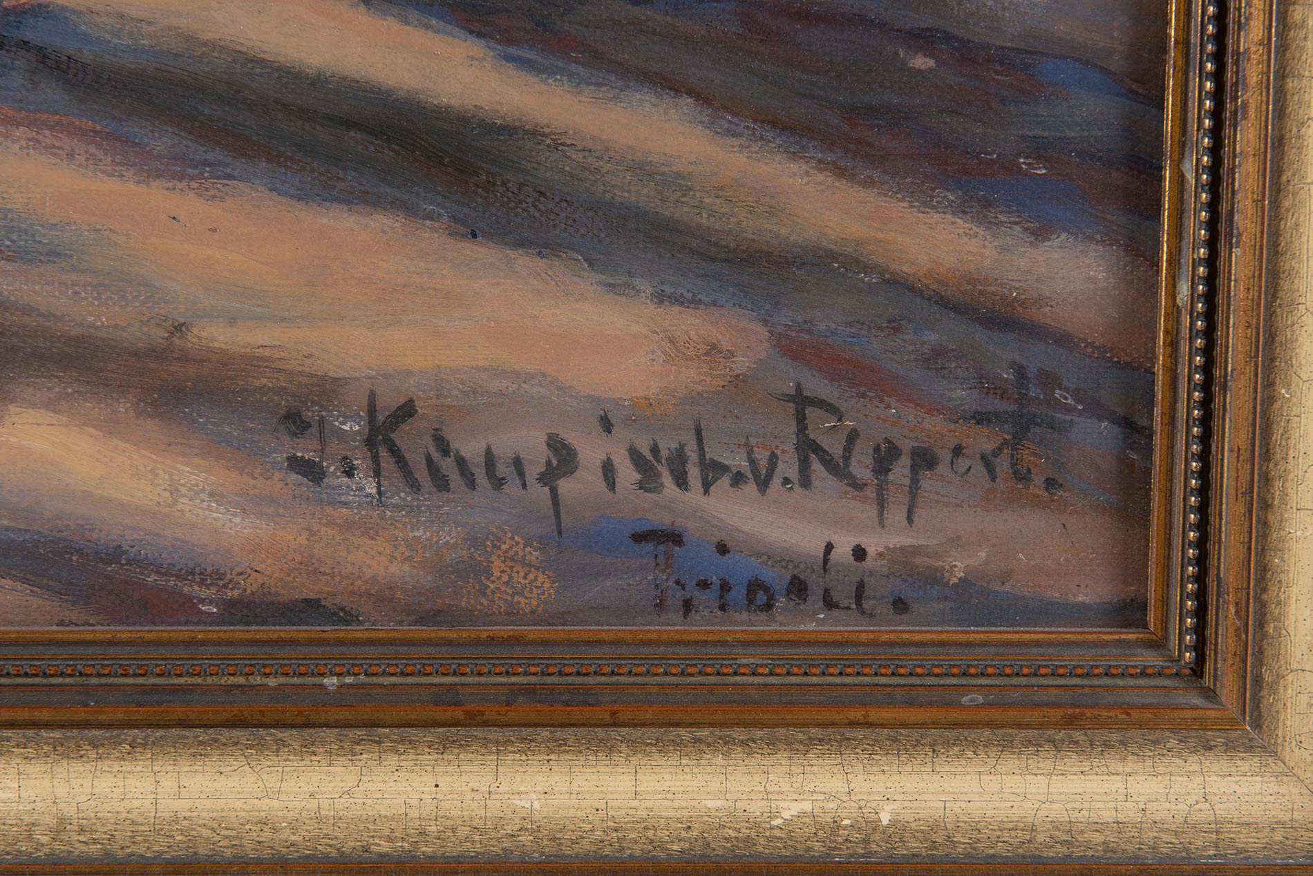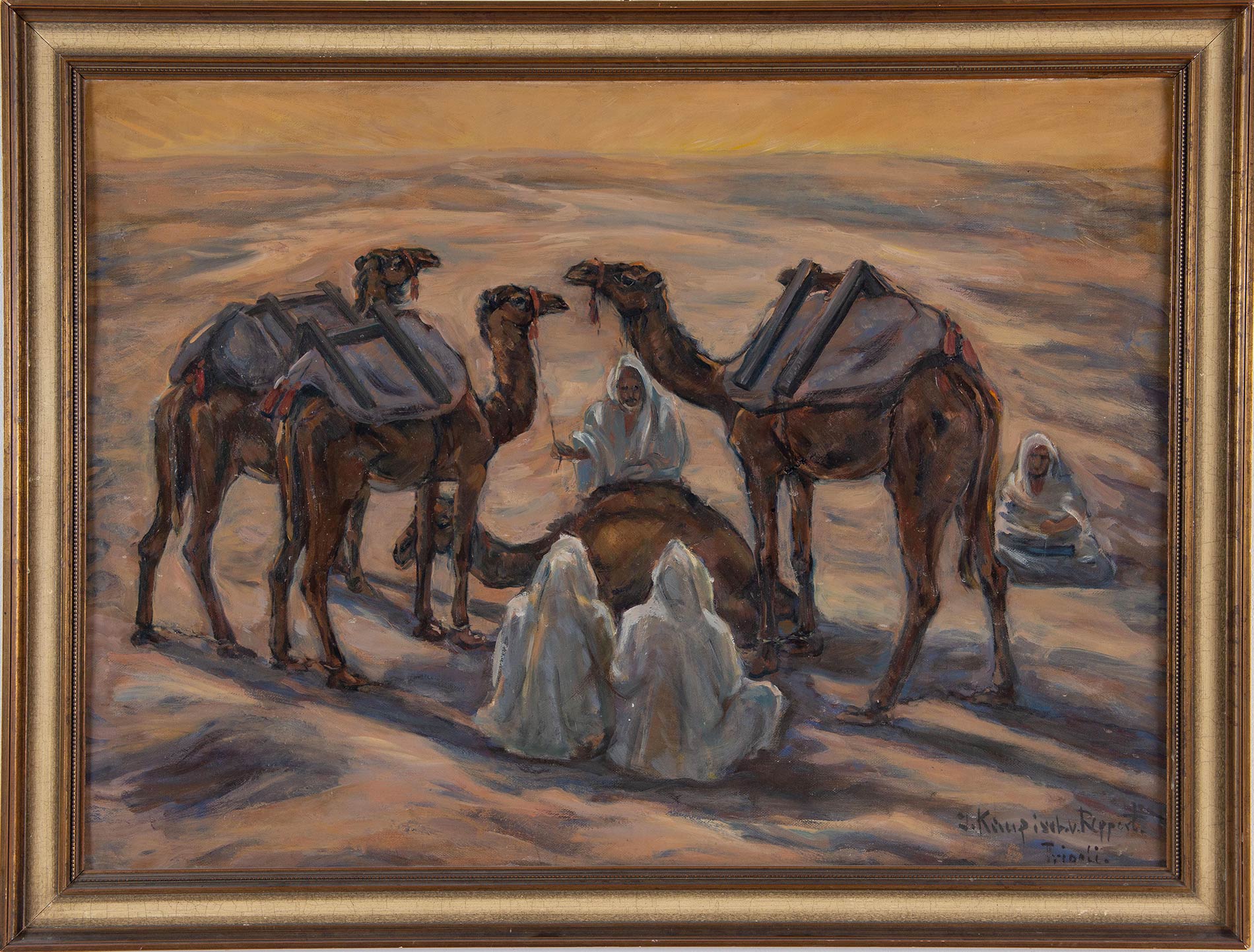 Pittore del XX sec., “Tripoli”. Olio su tela applicata su cartone, firma non decifrata in basso a destra e titolo Tripoli, H cm 70x96