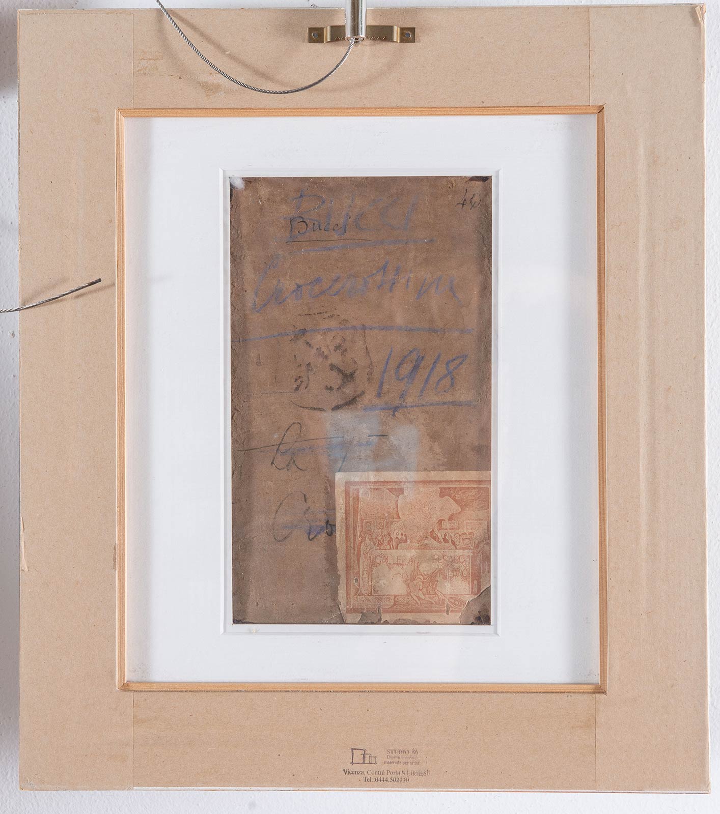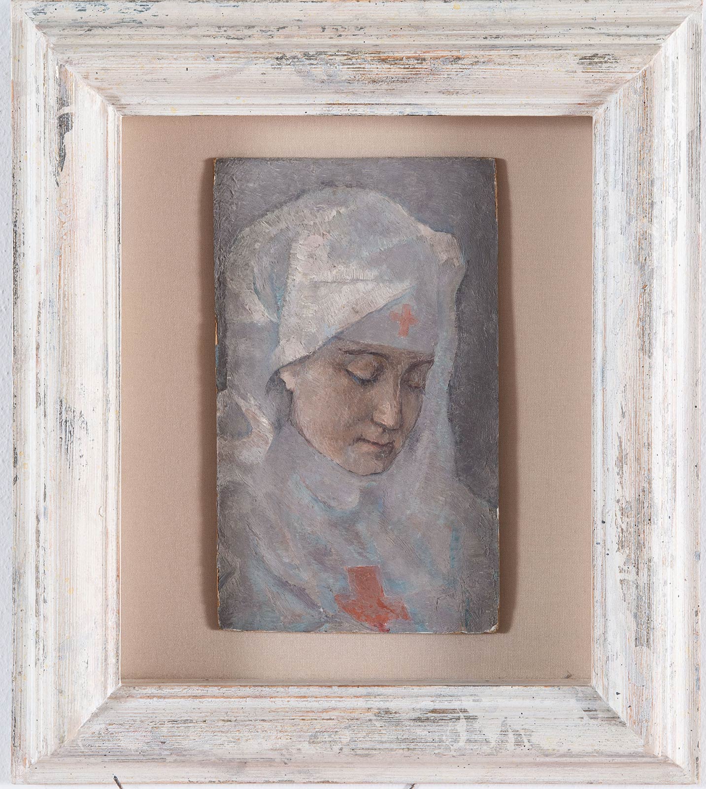 Anselmo Bucci (Fossombrone 1887 - Monza 1955), “Crocerossina”. Olio su cartone, firmato, titolato e datato sul retro ‘Bucci /Crocerossina/1918’, H cm 24.9x14.8 Al retro reca etichetta Galleria Pesaro – Milano. Esposizioni: Mostra Personale del 1923, Galleria Pesaro – Milano. Opera accompagnata da Autentica di Camillo Mapelli, Galleria d’Arte Antologia, Monza, 2012, n. B172.
