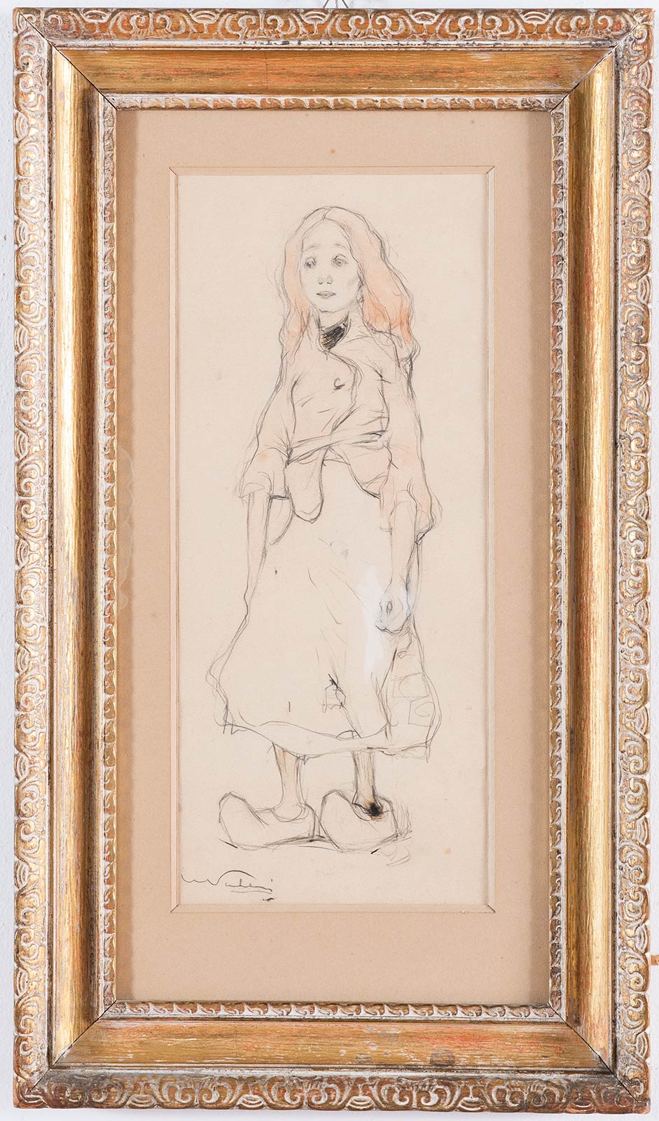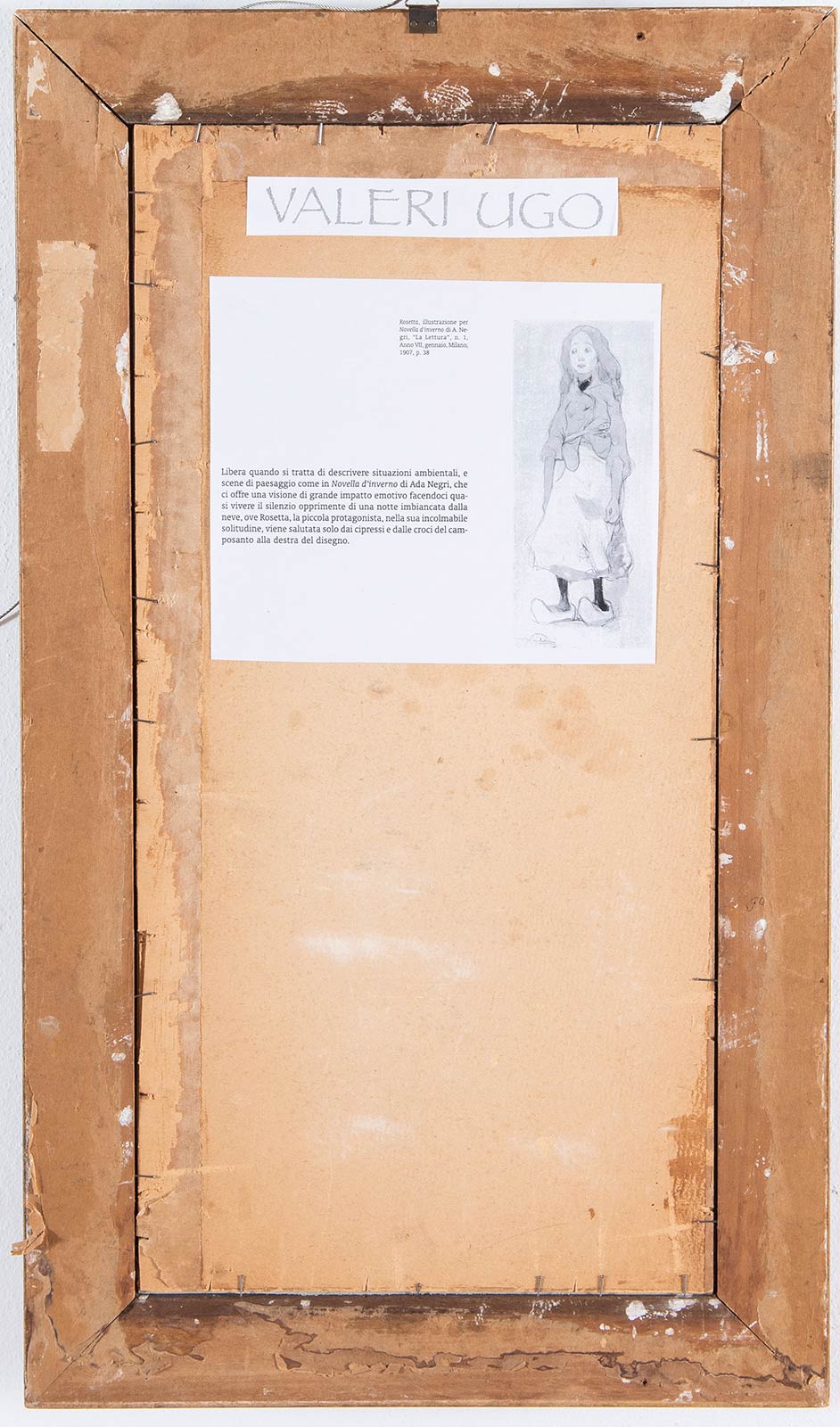 Ugo Valeri (Piove di Sacco 1873 - Venezia 1911), “Rosetta”, 1907. Matita e acquerello su cartoncino, firmato in basso a sinistra Valeri, H cm 51x23 Bibliografia di riferimento: Illustrazione per “Novella d’inverno” di A. Negri, “La Lettura”, n1, Anno VII, Gennaio, Milano, 1907, p. 38.