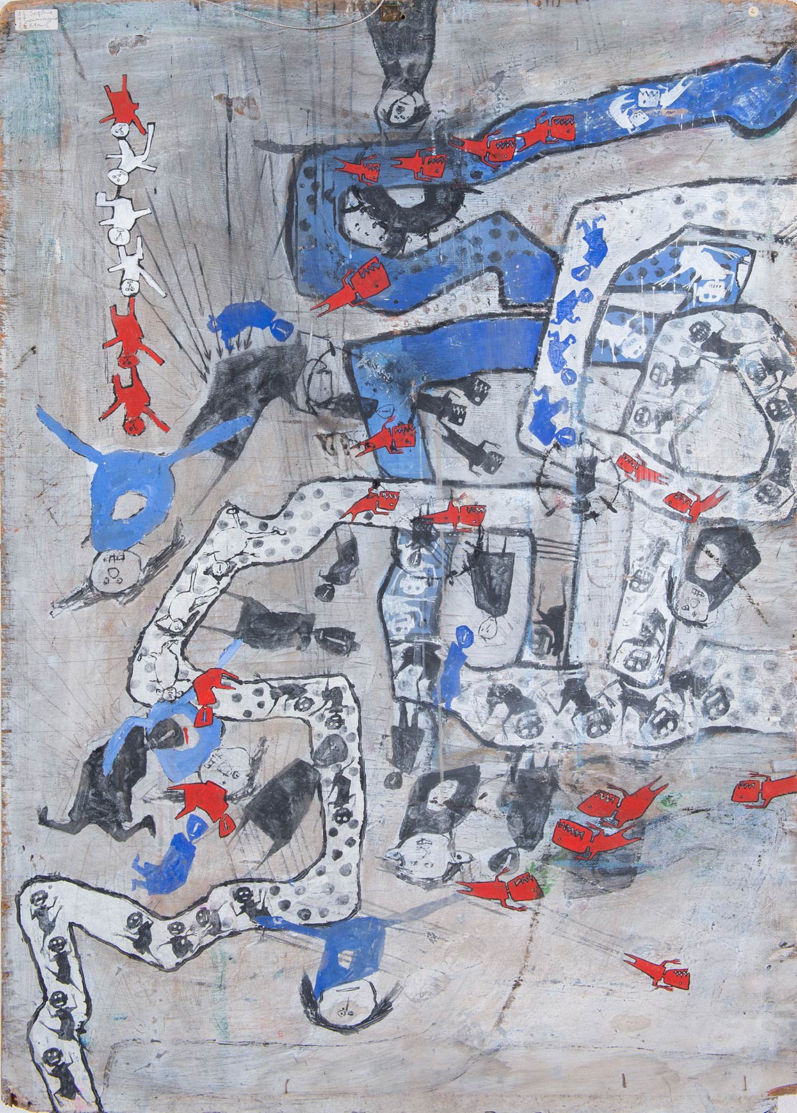 Sophie Thomassin (1957), “Astratto con figure”, 1988. Acrilico su tavola recto-verso, firmato e datato Sophie 1988, H cm 115x75