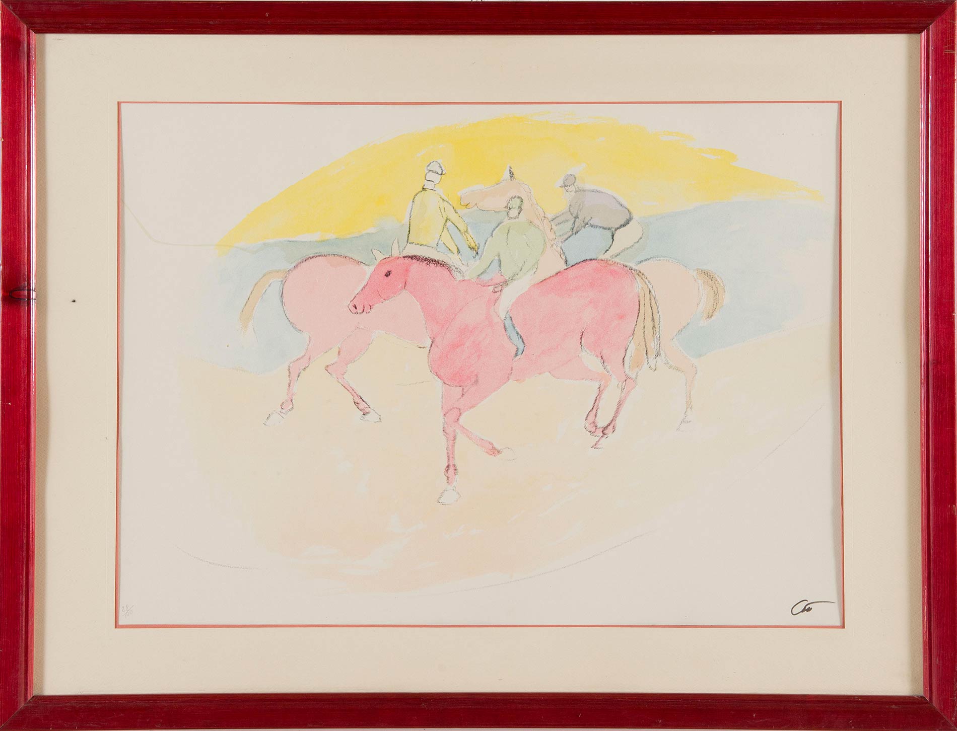 Giuseppe Cesetti (Tuscania 1902 - 1990), “Cavalli”. Litografia a colori su carta, firmata in basso a destra Cesetti, numero di tiratura in basso a sinistra 28/100, Foglio H cm 49x67