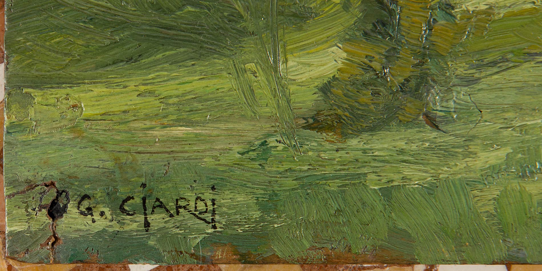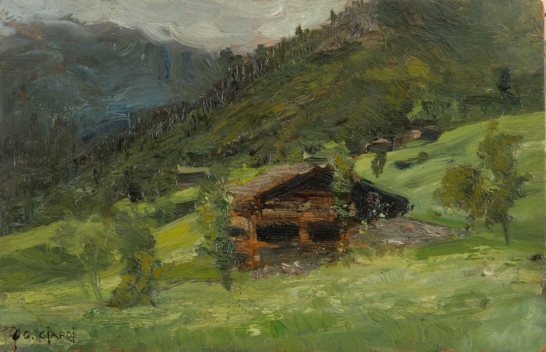Guglielmo Ciardi (Venezia 1842 - 1917), “La malga”, 1900 c. Olio su tavola, firmato in basso a sinistra G. Ciardi, titolo, firma e iscrizioni al retro, H cm 18x28 Provenienza: Eredi Ciardi Pasinetti – Venezia. Al retro reca etichetta e timbri Bottegantica – Bologna, “Maestri dell’Ottocento Italiano”, 3 Ottobre – 15 Novembre 1982.