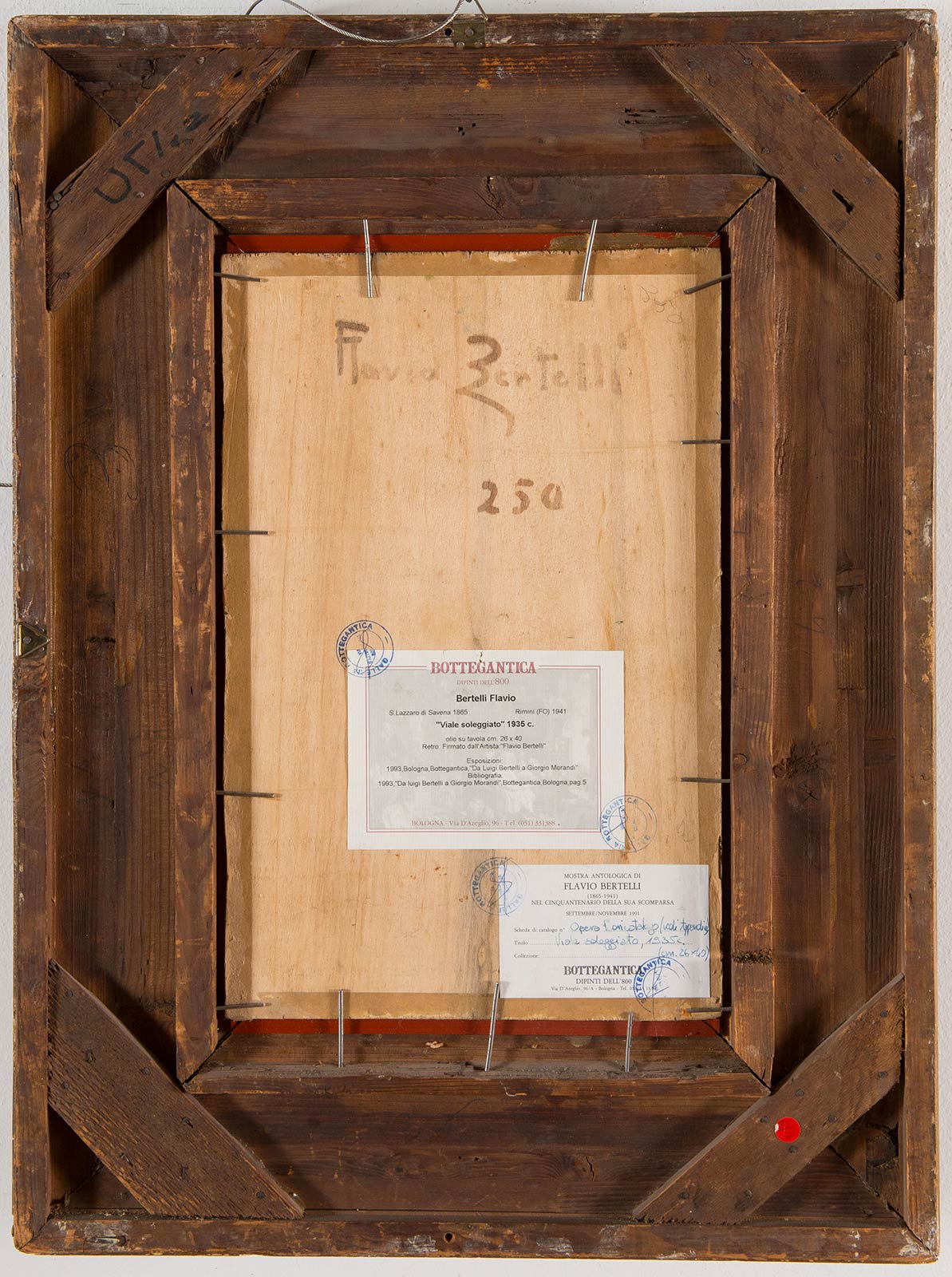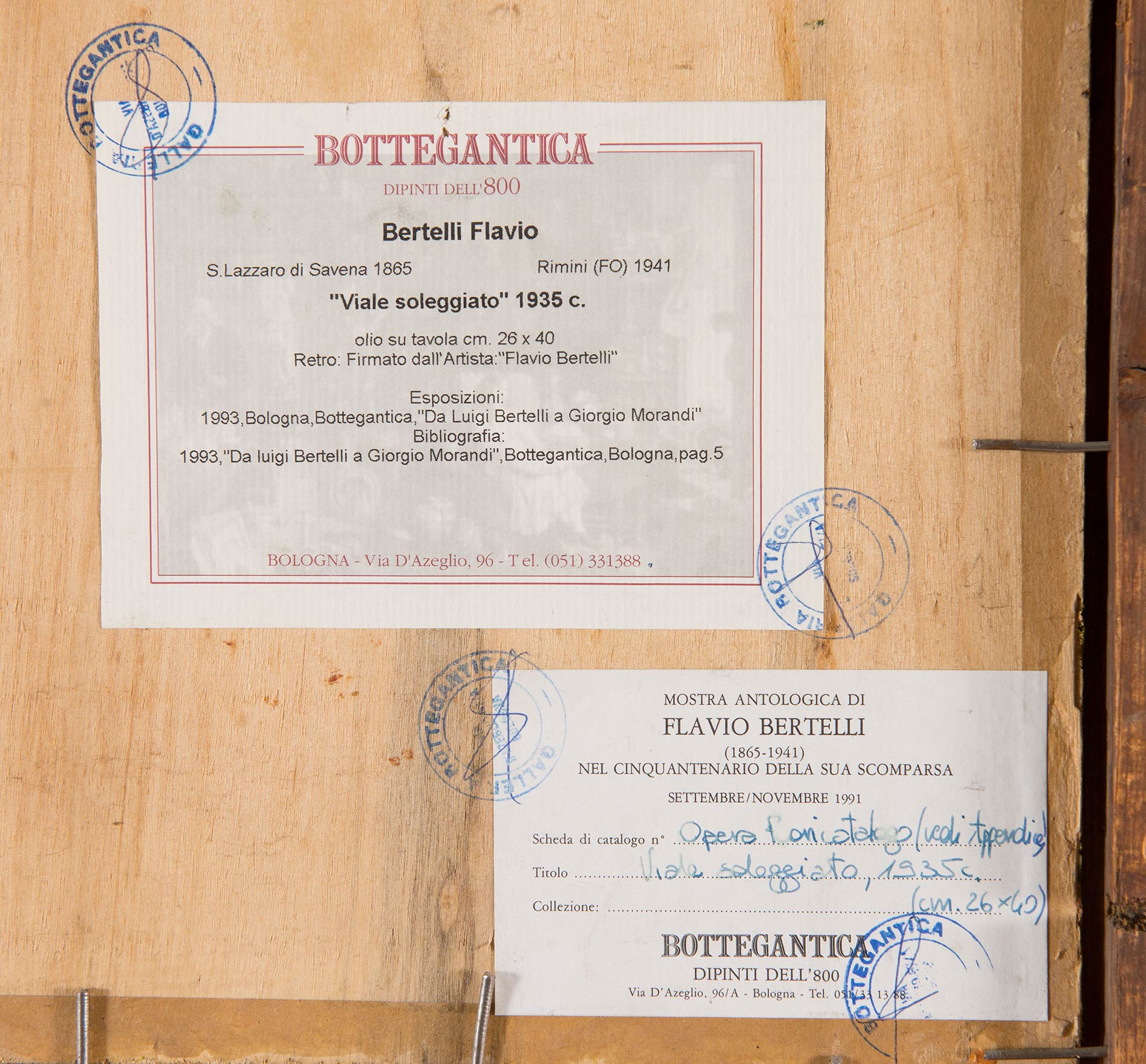 Flavio Bertelli (San Lazzaro di Savena 1865 - Rimini 1941), “Viale soleggiato”, 1935 c. Olio su tavola, firmato al retro ‘Flavio Bertelli’ e numero 250, H cm 40x26 Al retro reca etichetta e timbri Bottegantica – Bologna ed etichetta “Mostra Antologica di Flavio Bertelli nel cinquantenario della sua scomparsa”, Settembre/Novembre 1991. Esposizioni: Bologna Bottegantica, “Da Luigi Bertelli a Giorgio Morandi” - 1993;“Mostra Antologica di Flavio Bertelli nel cinquantenario della sua scomparsa” - 1991. Bibliografia: Catalogo “Da Luigi Bertelli a Giorgio Morandi”, Bottegantica Bologna, p. 5.