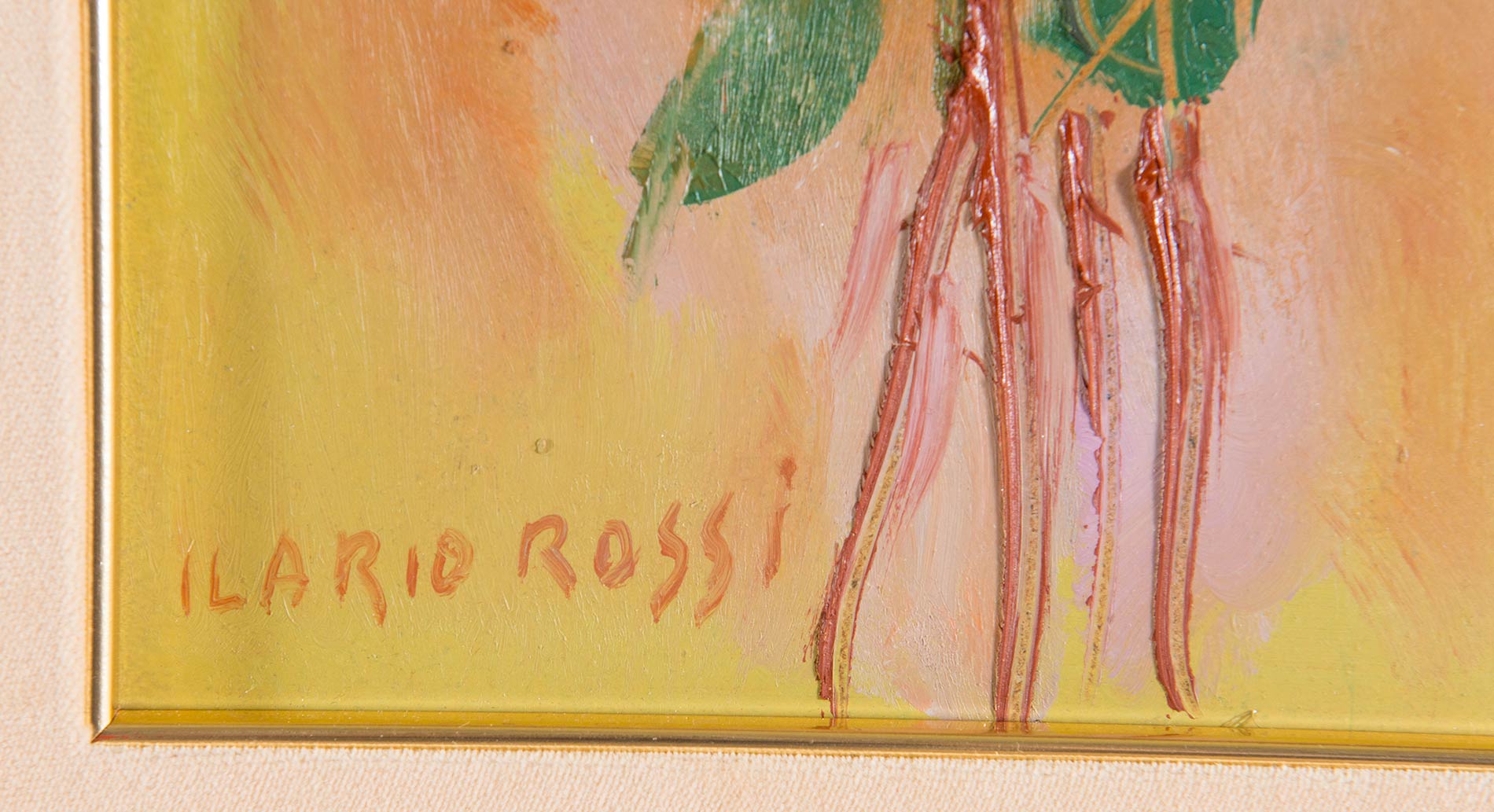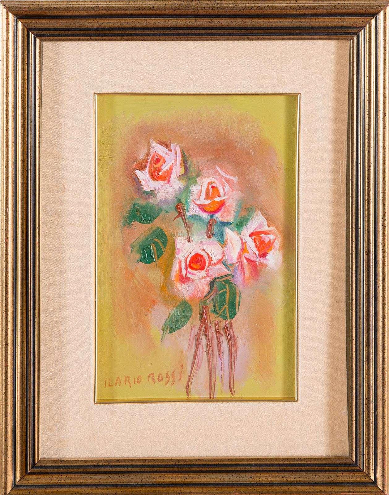 Ilario Rossi (Bologna 1911 - 1994), “Rose”. Olio su masonite, firmato in basso a sinistra Ilario Rossi, al retro iscrizione per autentica ‘Rose/autentico/Ilario Rossi’, H cm 27x17