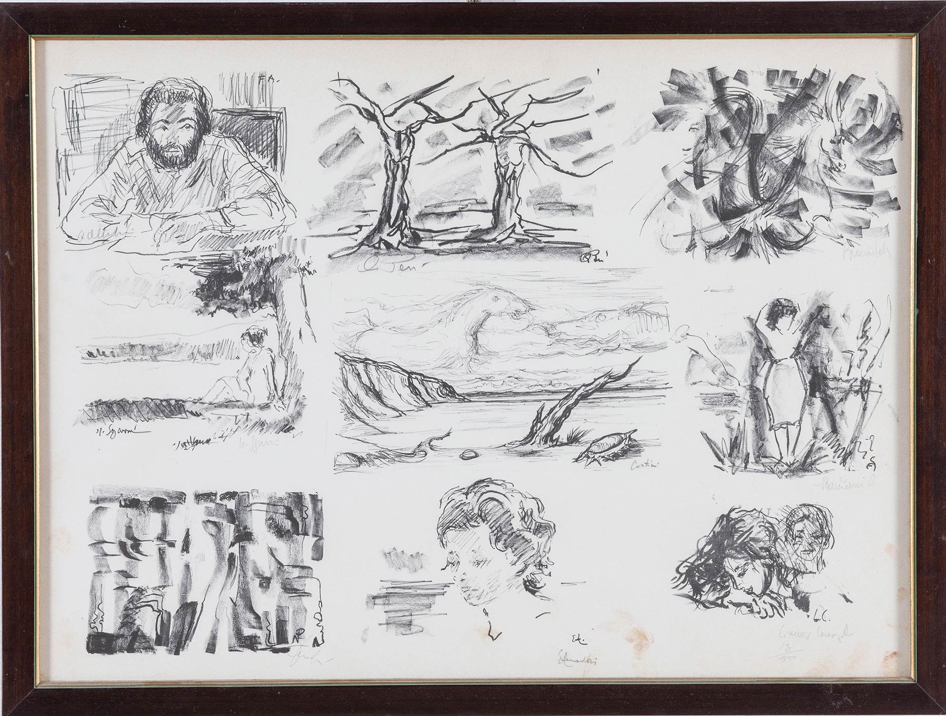 Nove incisioni composte sullo stesso foglio, Anni ‘60. Eseguite da vari artisti: Umberto Sgarzi, Eugenio Amadori, Lorenzo Ceregato, Maria Stanzani, Emilio Contini, Filippo Albertoni, Sergio Romiti, H cm 47x65