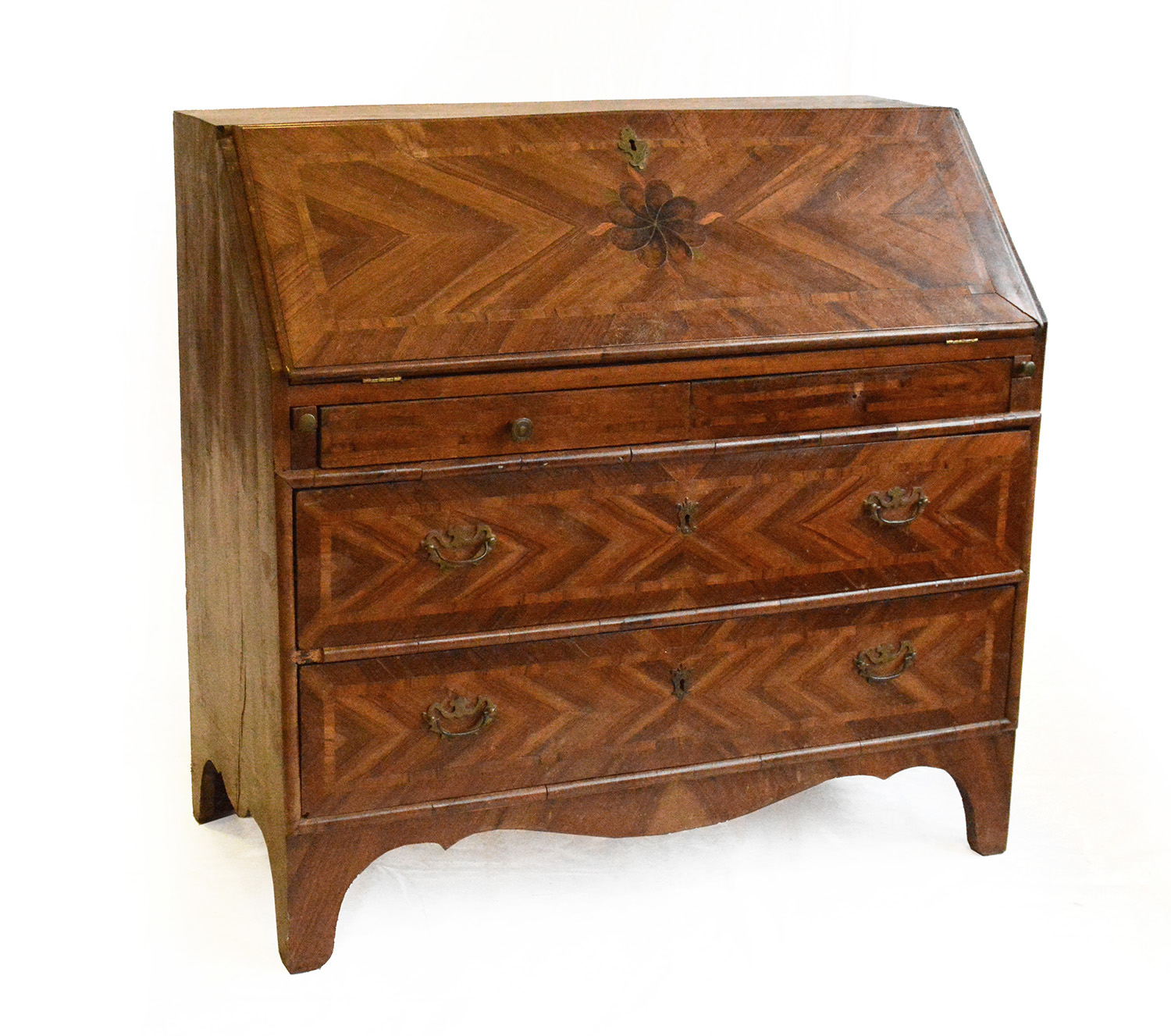 Ribalta lastronata e filettata in legni vari, fronte a due cassetti e due in linea, anta ribaltabile centrata da motivo floreali e celante vani e cassettini. Secolo XVIII (cm 111,5x108x54) (difetti e restauri)