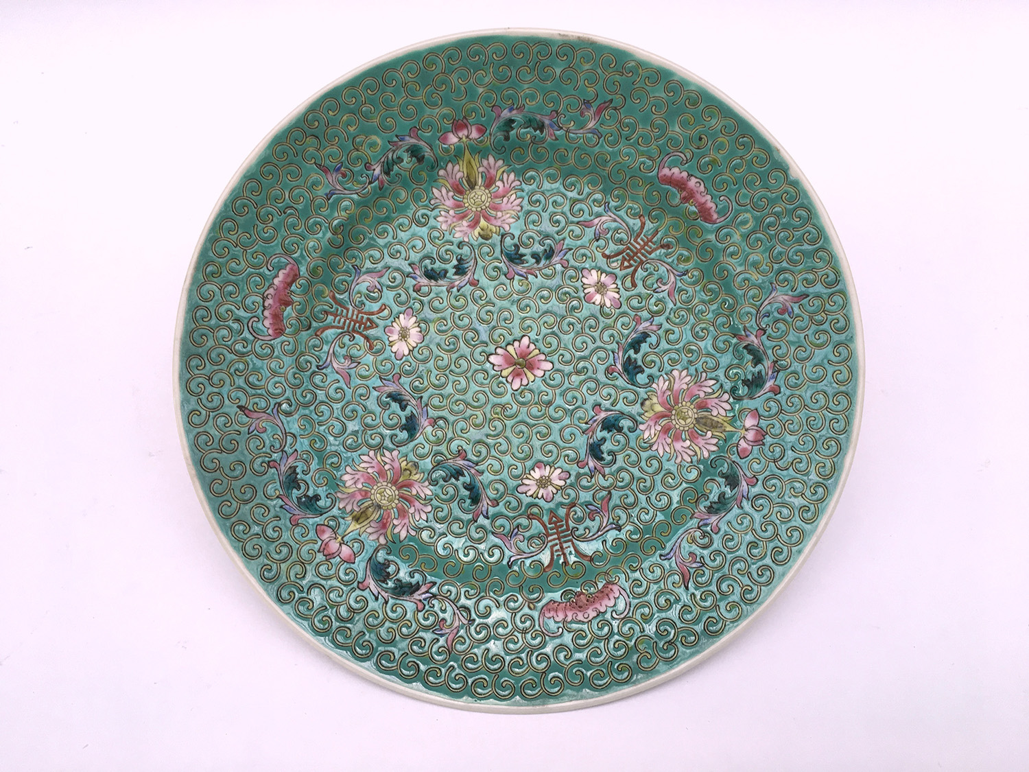Piatto a decoro floreale in porcellana Famiglia Rosa su fondo turchese, marchio