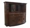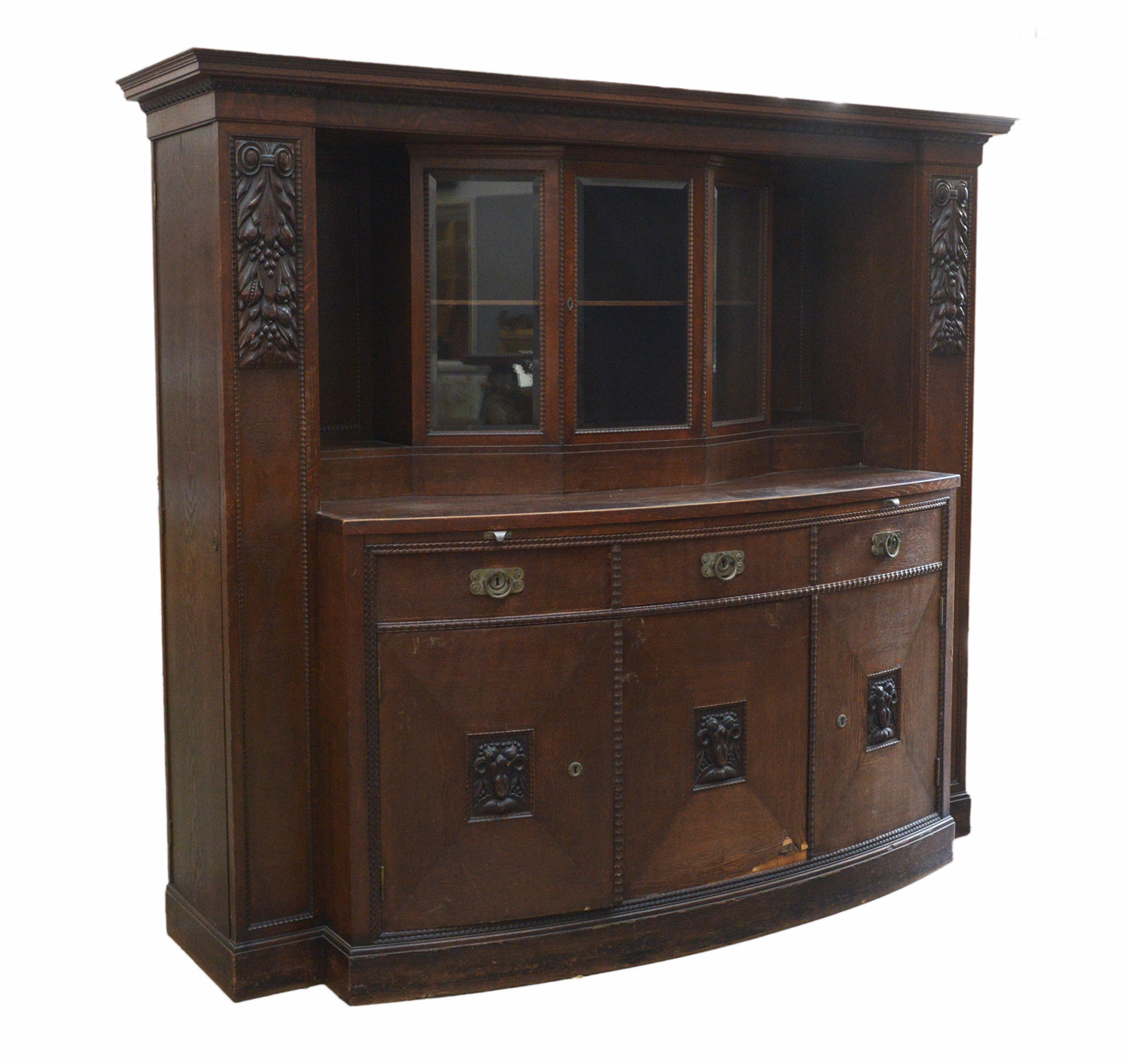 Credenza in rovere con fronte curvilineo, tre ante e tre cassetti nella parte inferiore, decorata con riserve scolpite a frutti e motivi vegetali. Due ante laterali con mensoline all'interno, parte superiore con tre ante e vetri. Due tiretti estraibili sottopiano e maniglie in fusione metallica. Milano, 1920ca. (cm 208x184x70) (lievi difetti)