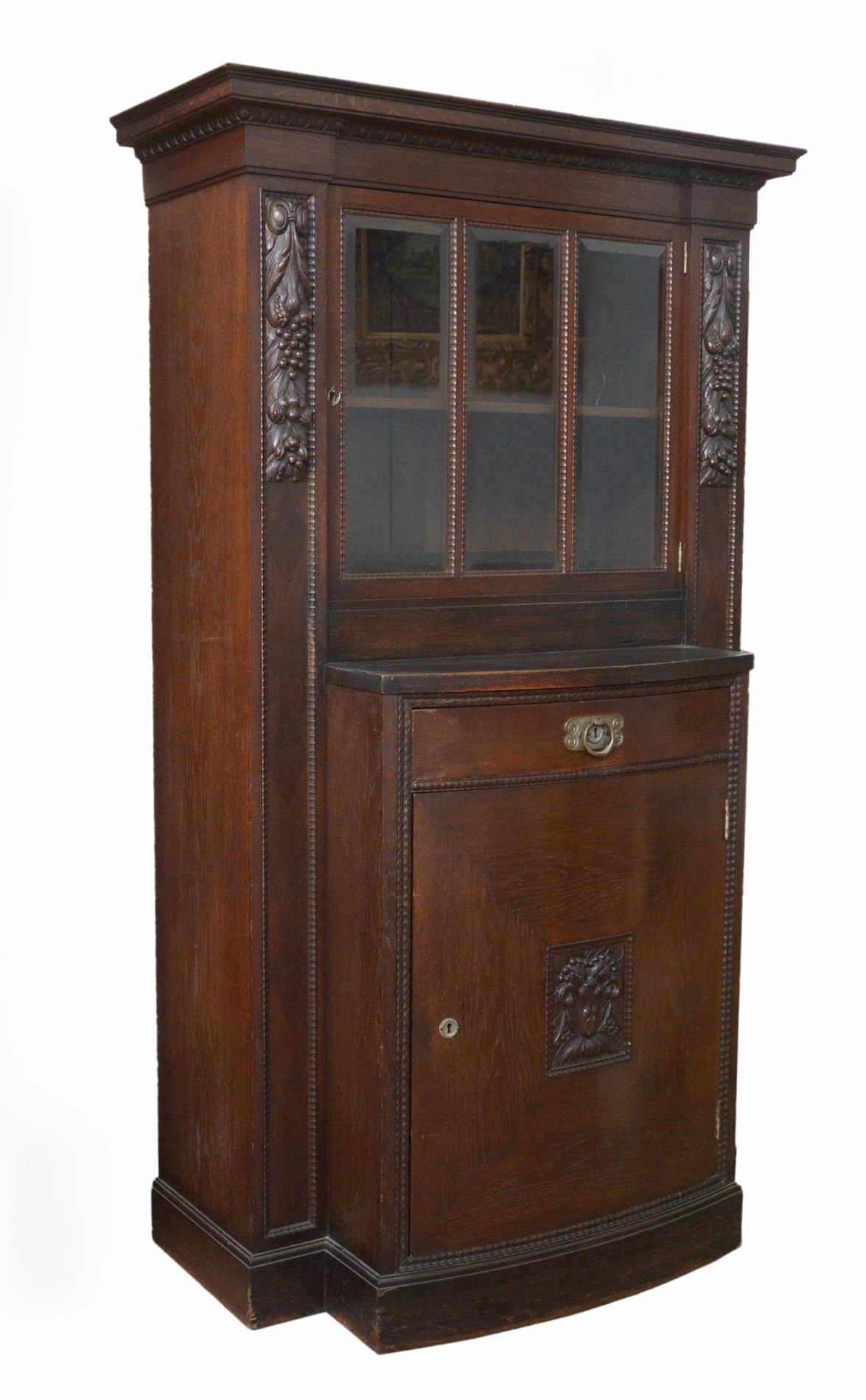 Credenza in rovere con parte centrale aggentante ad un'anta e un cassetto decorata con riserve scolpite a foglie, frutti e guarnizioni in fusione metallica. Parte superiore con anta a vetri. Milano, 1920ca. (cm 107x186x59) (difetti)