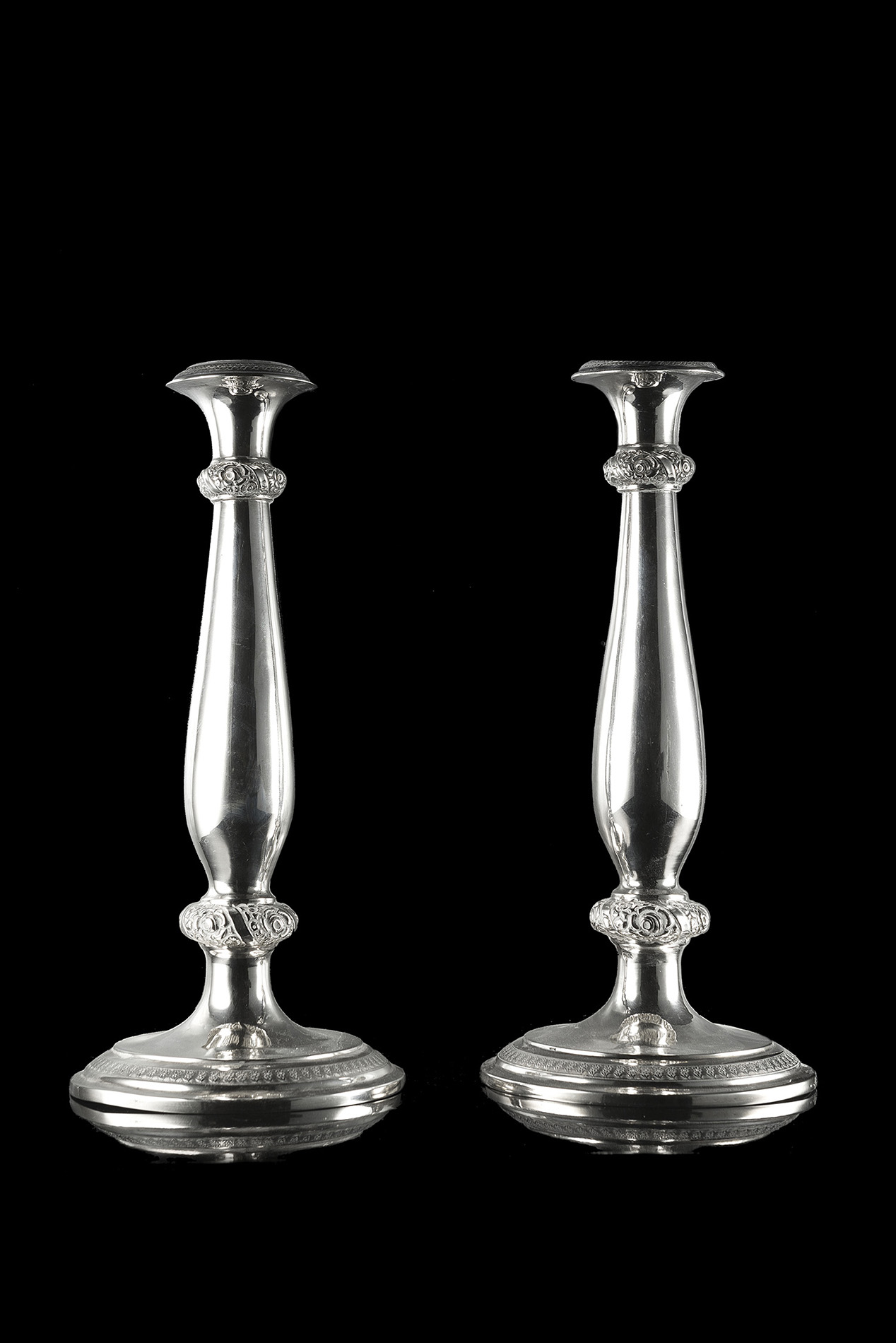 Coppia di candelieri in argento a corpo liscio poggianti su basi circolari, cesellati a fiori. Trieste, secolo XIX (g 566 ca.)