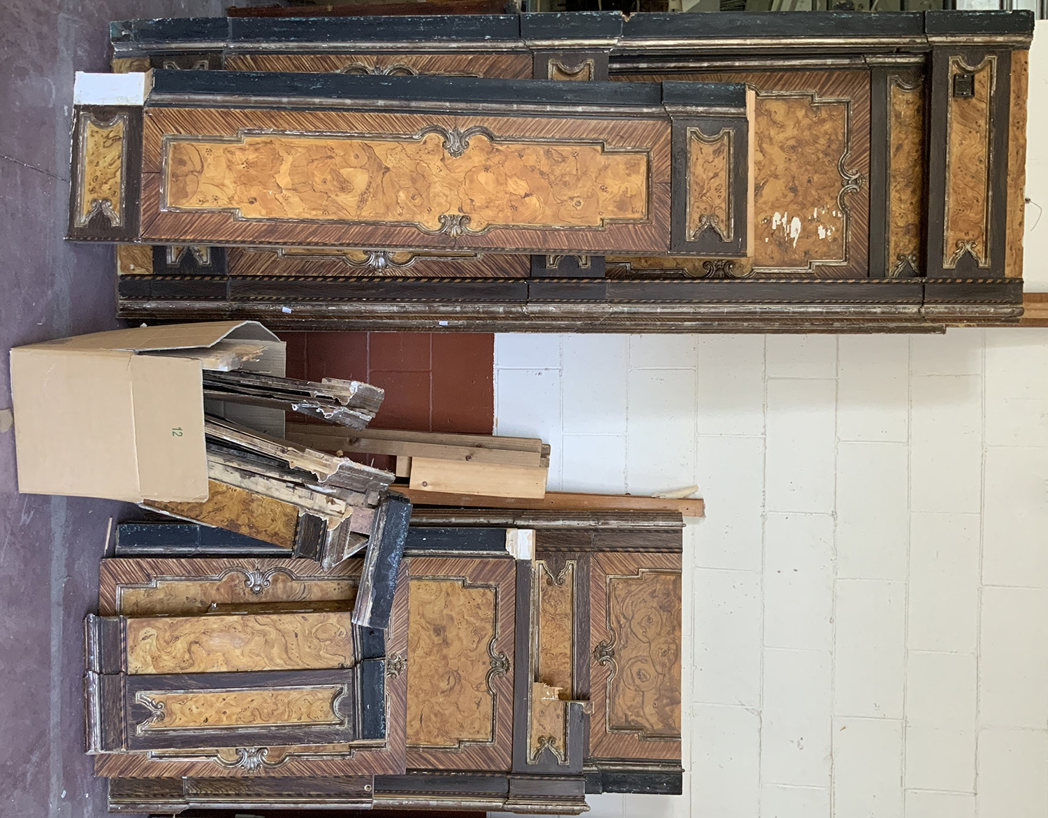 Parte di boiserie formata da pannelli laccati a chinoiserie con fregi a finto marmo (h. max cm 82) (difetti)