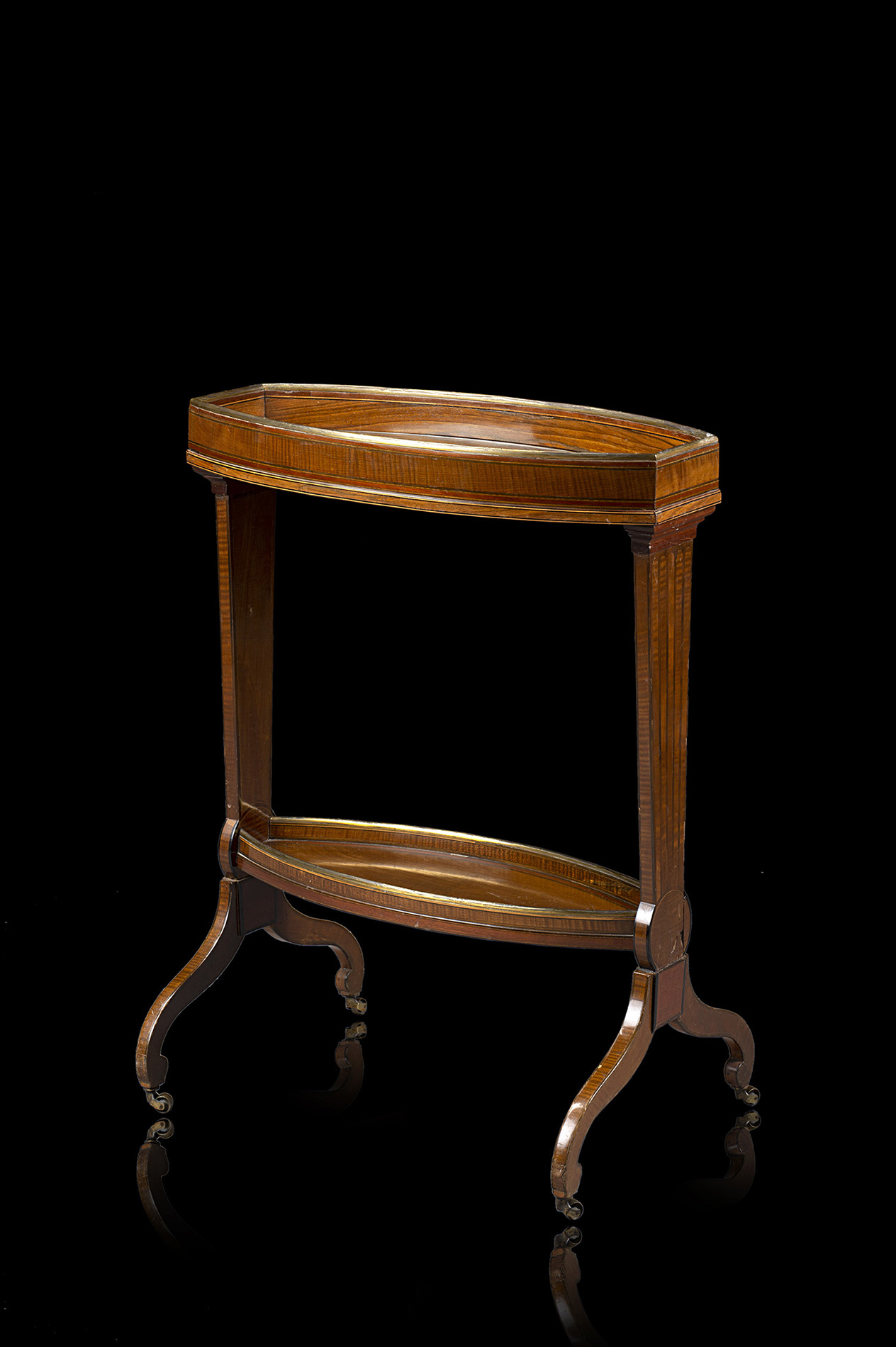 Tavolo a vassoio a due ripiani con fasce filettate in legno chiaro e decorate da ringhiere in metallo dorato. Montanti intarsiati a finte scanalature, piedi a riccioli muniti di rotelle. Francia, secolo XIX (cm 56x72x38) (difetti)